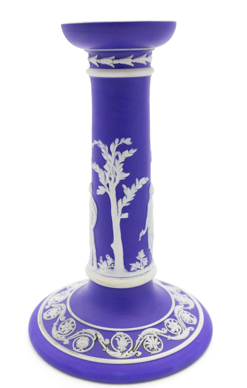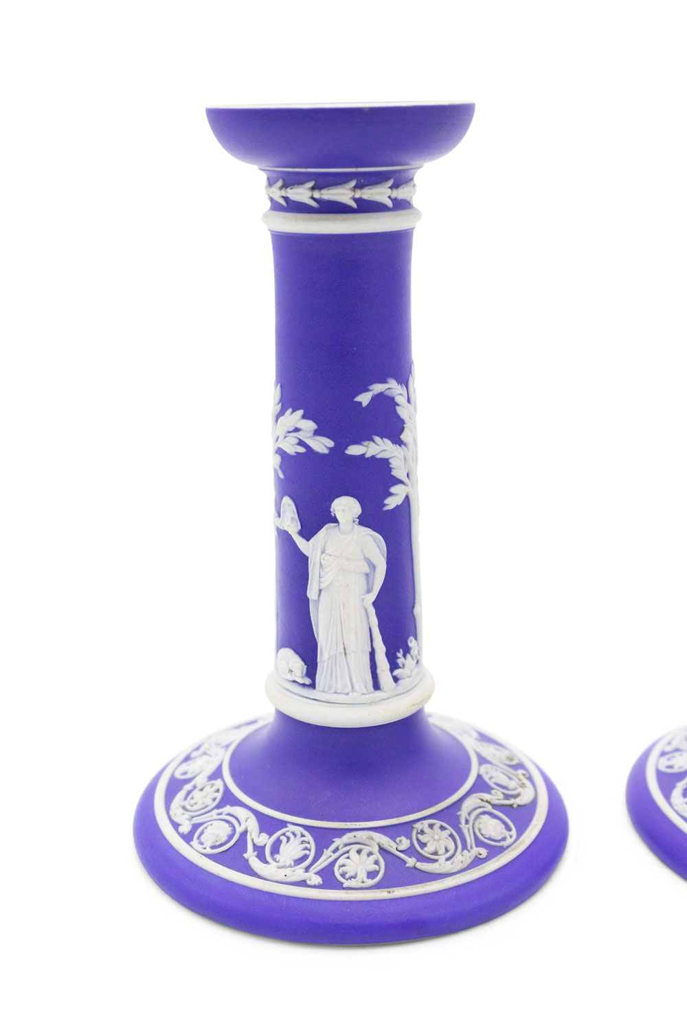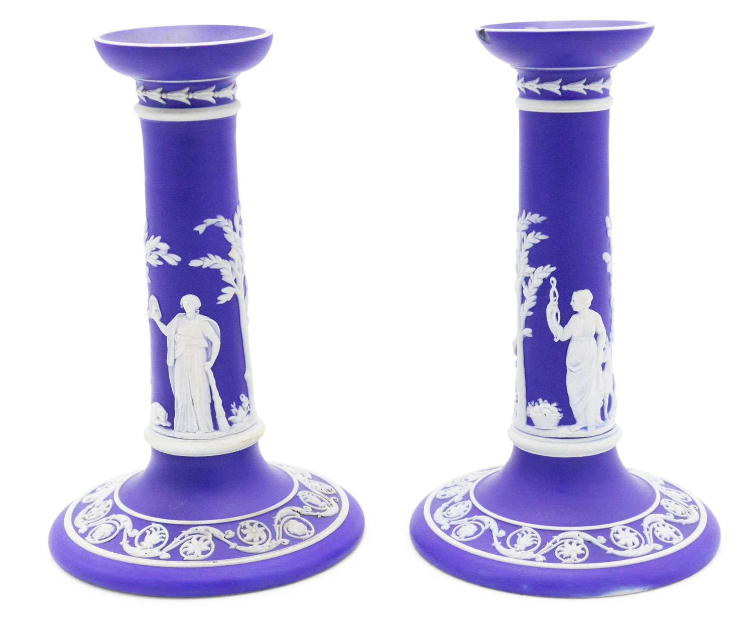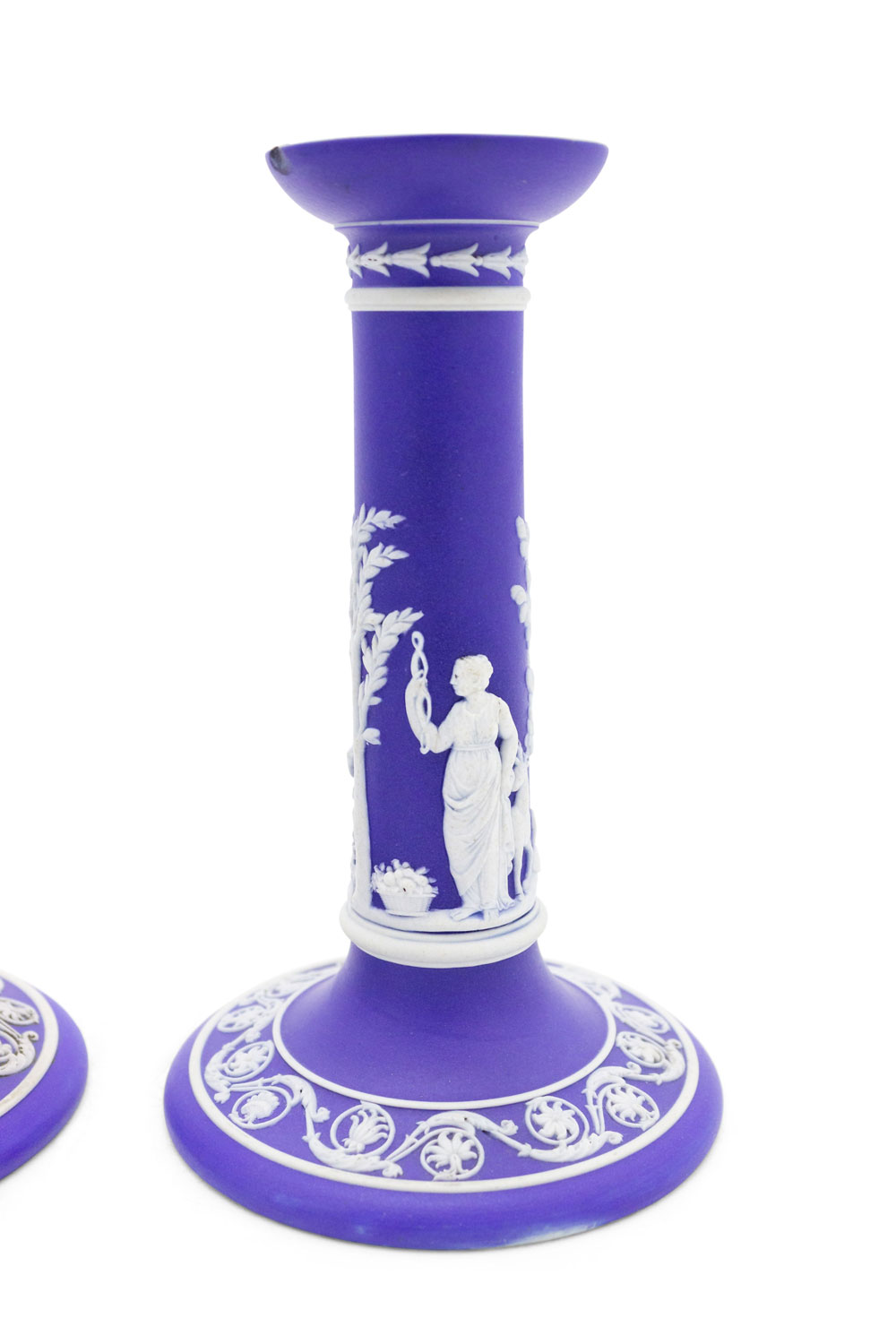 PAIR of English Adam-style (19/20th Century) blue and white Wedgwood porcelain candlesticks with classical figures and scroll decorated base (PRICED AS PAIR).
