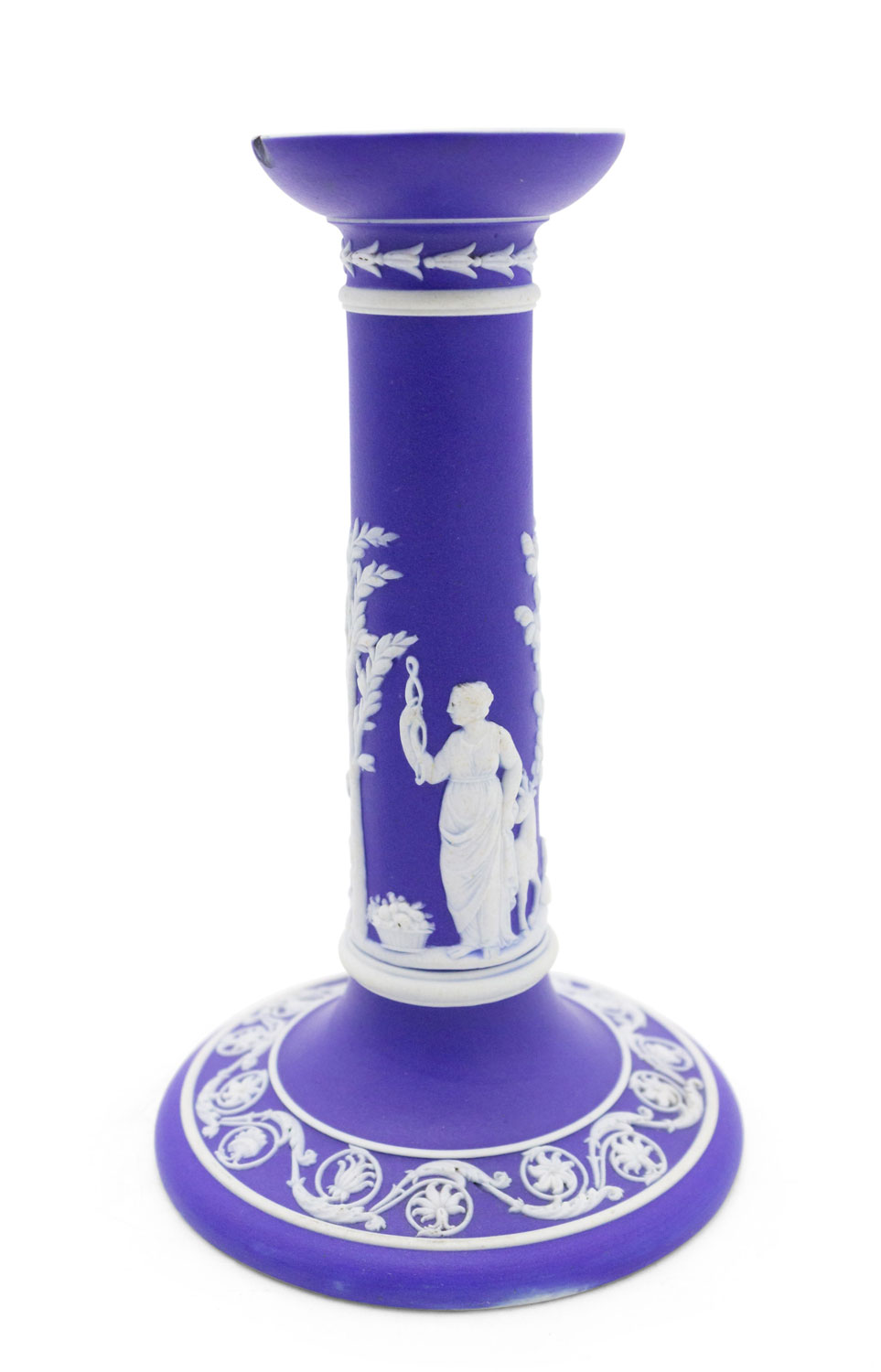 PAIR of English Adam-style (19/20th Century) blue and white Wedgwood porcelain candlesticks with classical figures and scroll decorated base (PRICED AS PAIR)