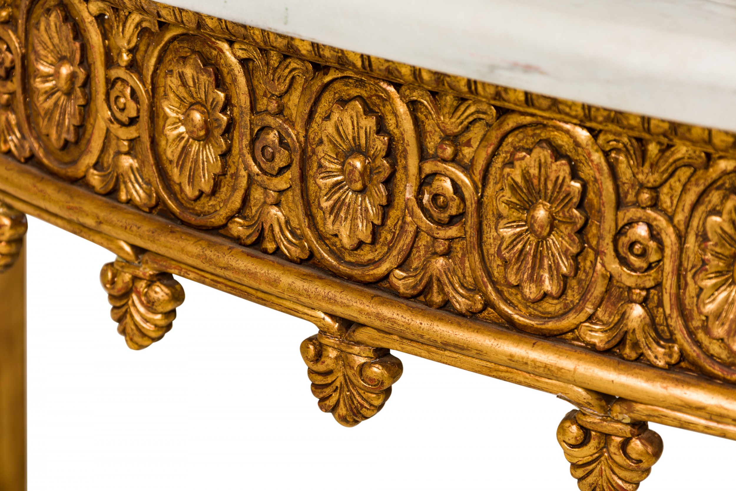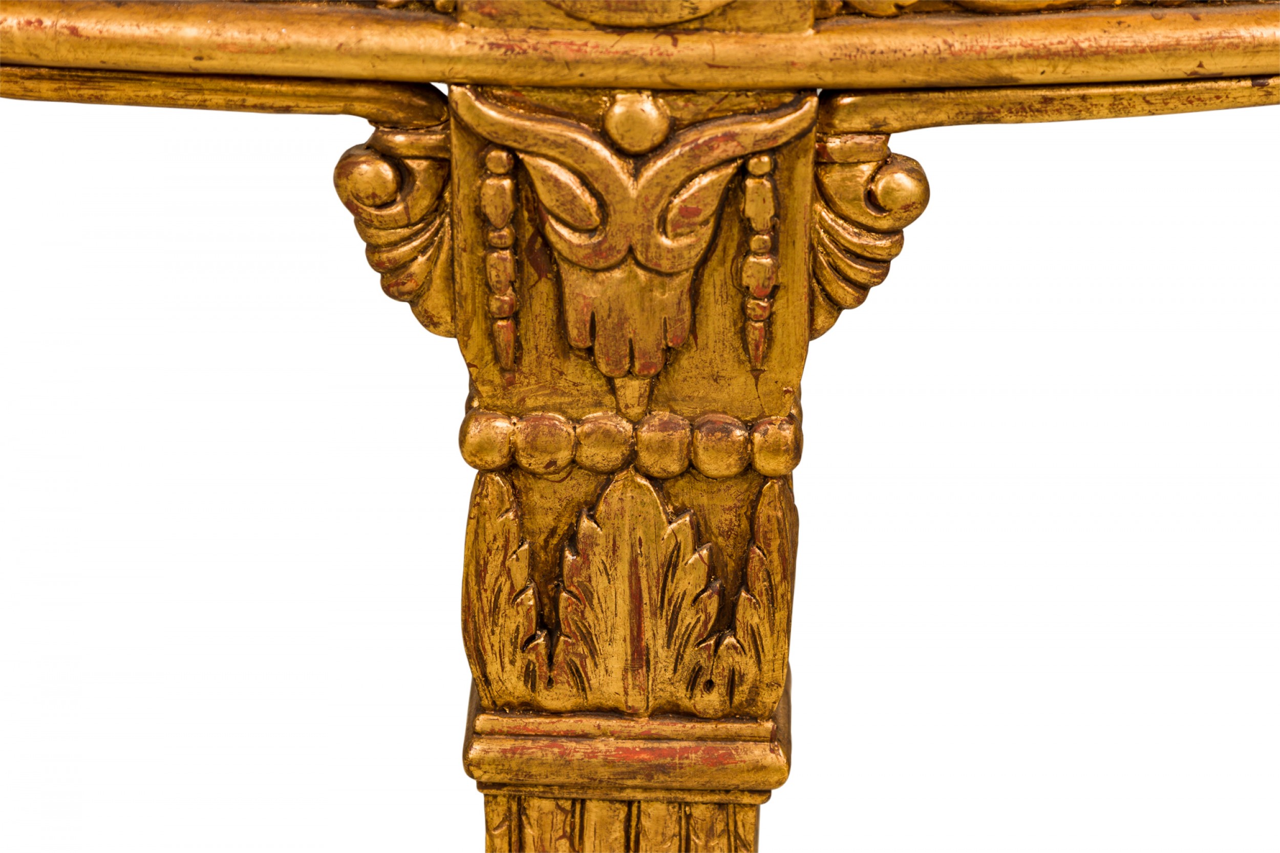 PAIR of English Adam-style (20th Century) gilt carved demilune shaped console tables with finials on apron and fluted rectangular legs. (PRICED AS PAIR)