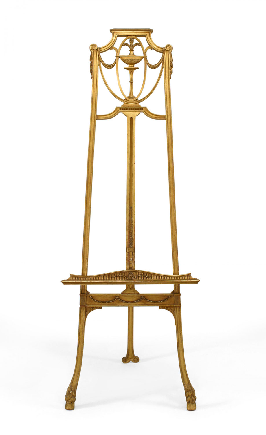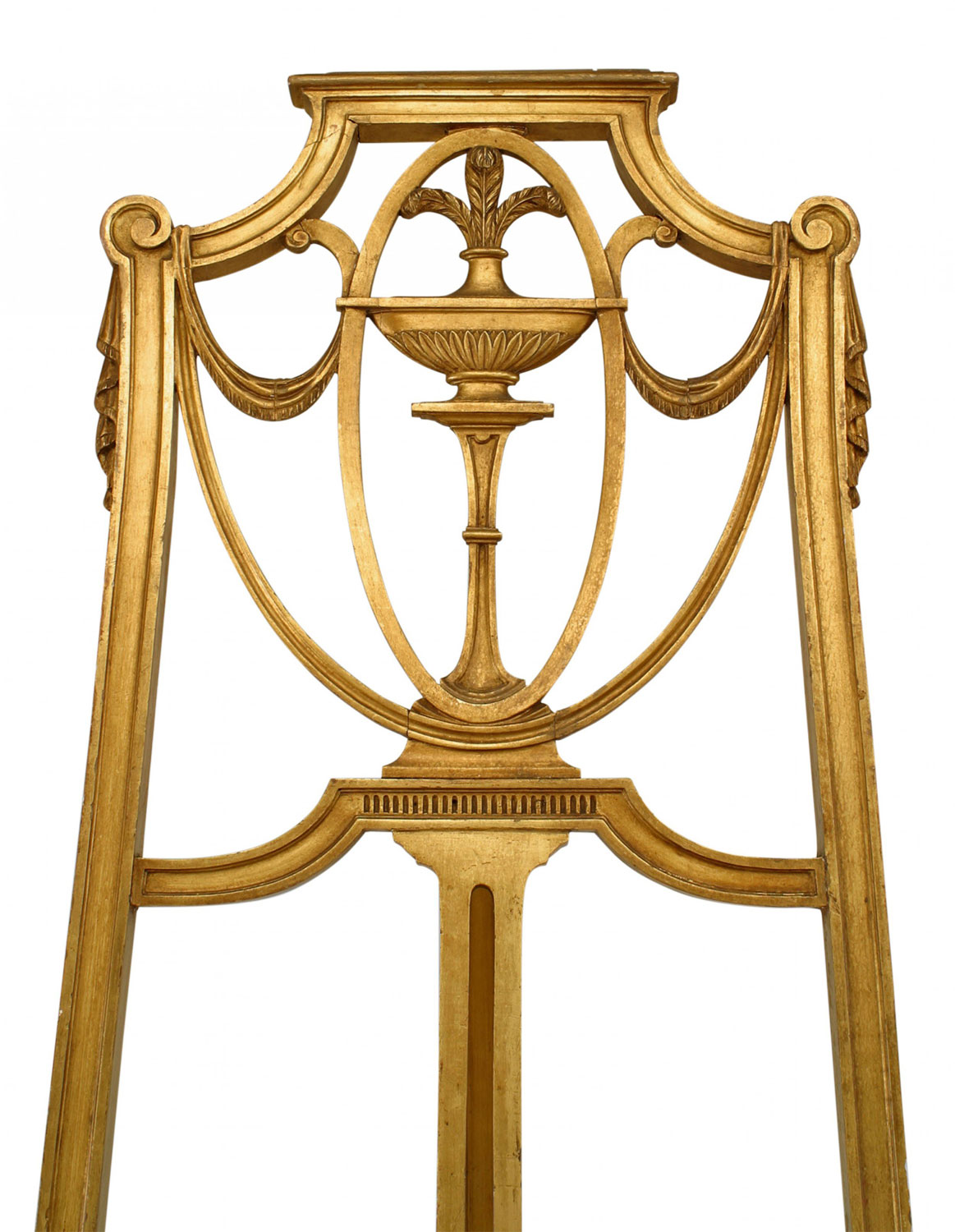 English Adam style (19th Cent) gilt easel stand with carved swag and plume top..