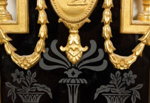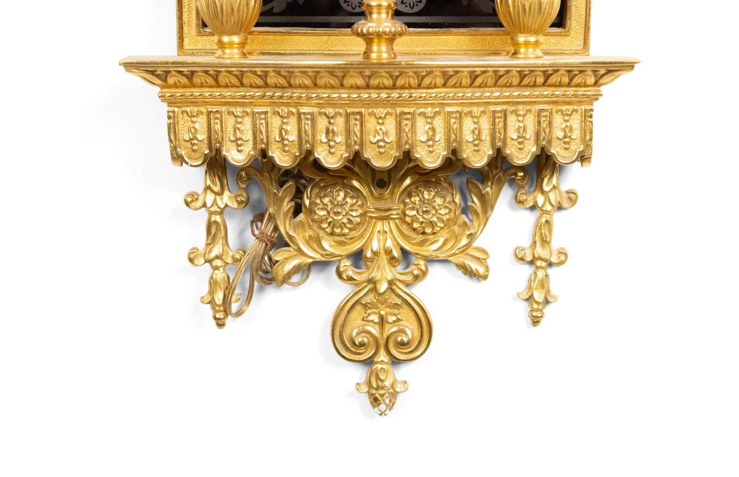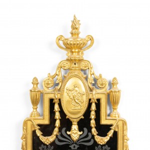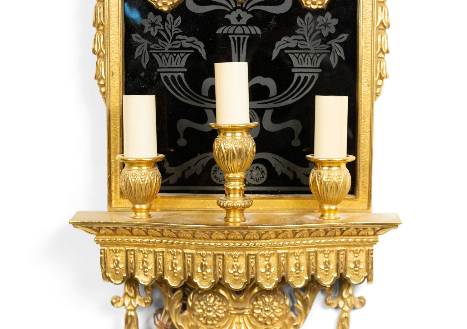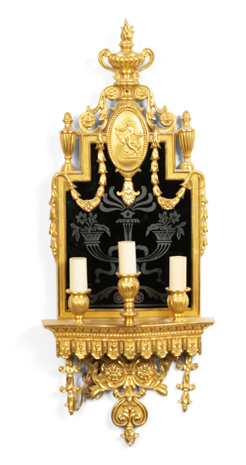 English Adam style (19/20th Century) bronze dore wall sconce with three lights, urn shaped top, and etched black glass back panel.
