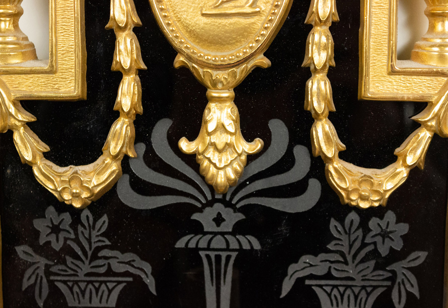 English Adam style (19/20th Century) bronze dore wall sconce with three lights, urn shaped top, and etched black glass back panel..