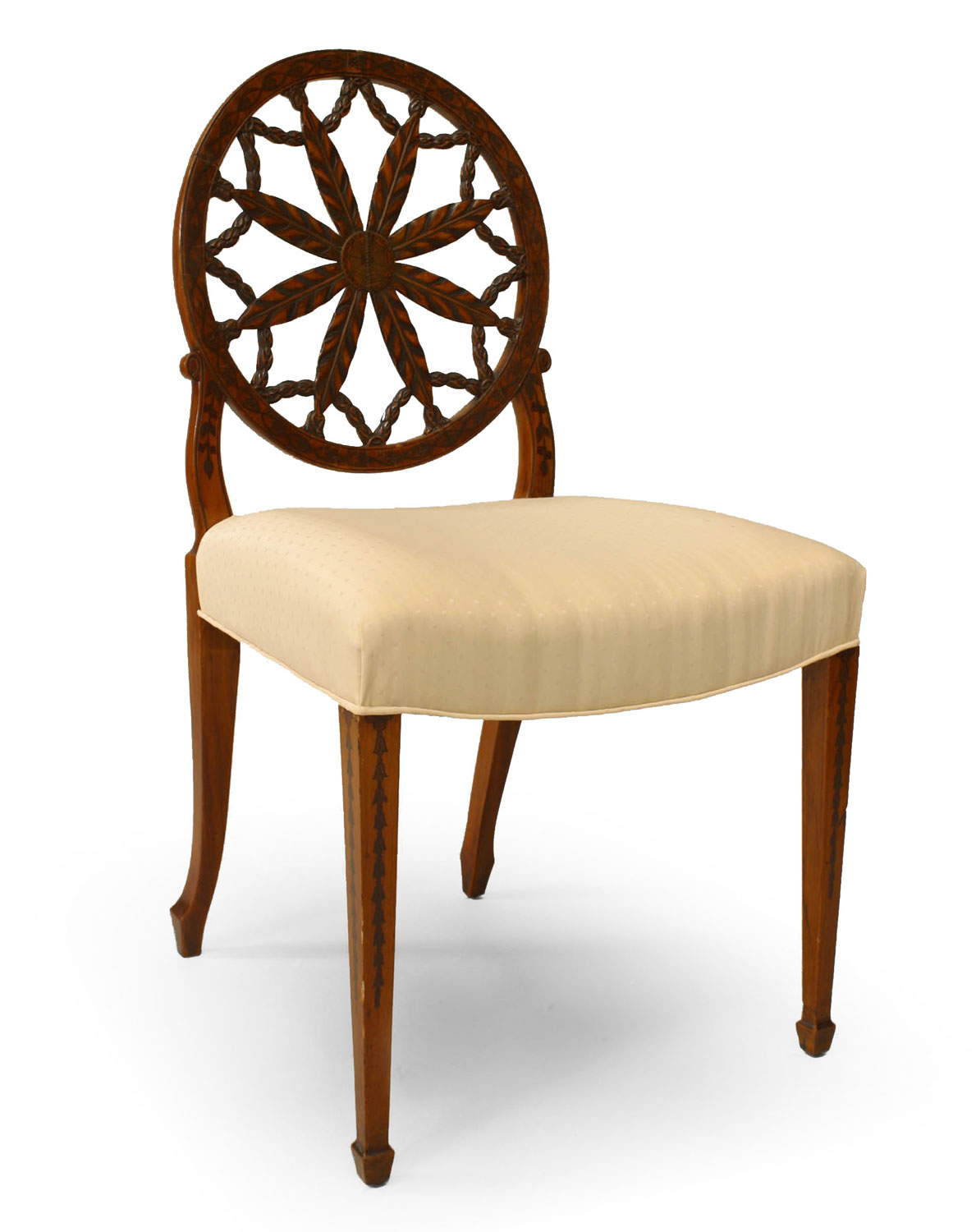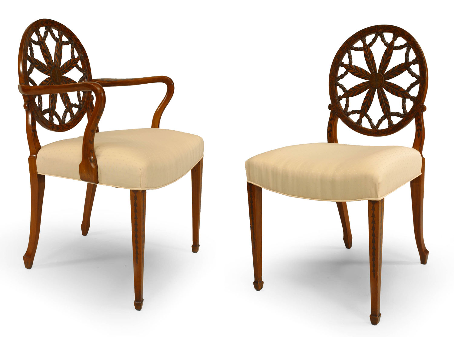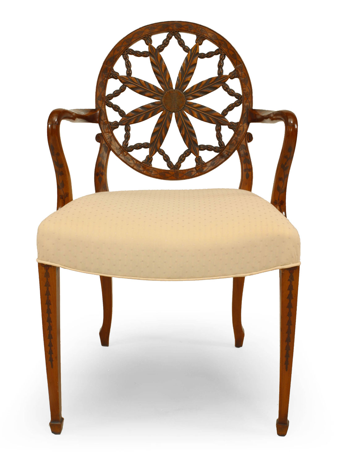SET of 8 English Adam style (19th Century) satinwood chairs with carved open wheel back design and beige upholstered seat (2 arm chairs, 6 side chairs).