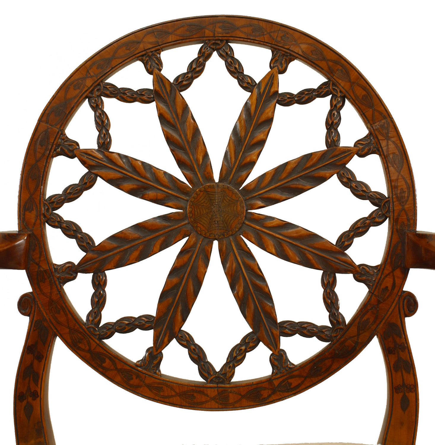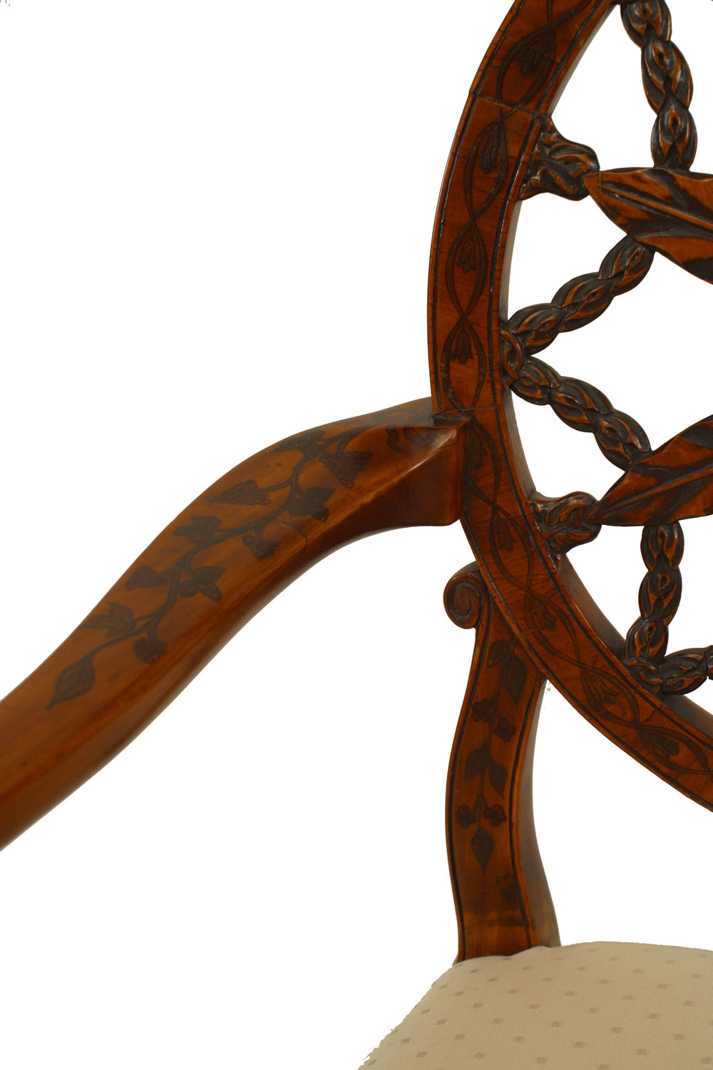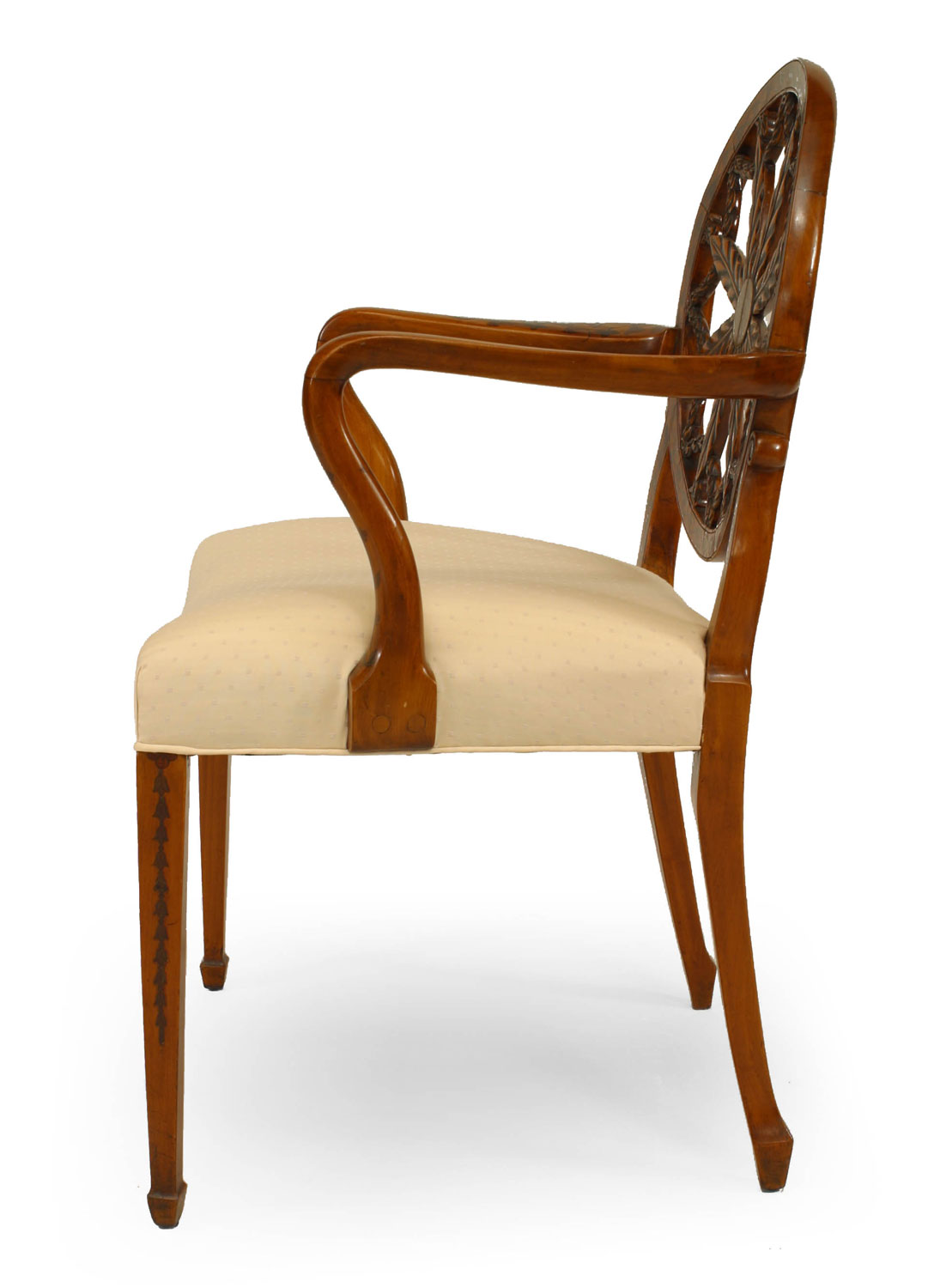 SET of 8 English Adam style (19th Century) satinwood chairs with carved open wheel back design and beige upholstered seat (2 arm chairs, 6 side chairs).