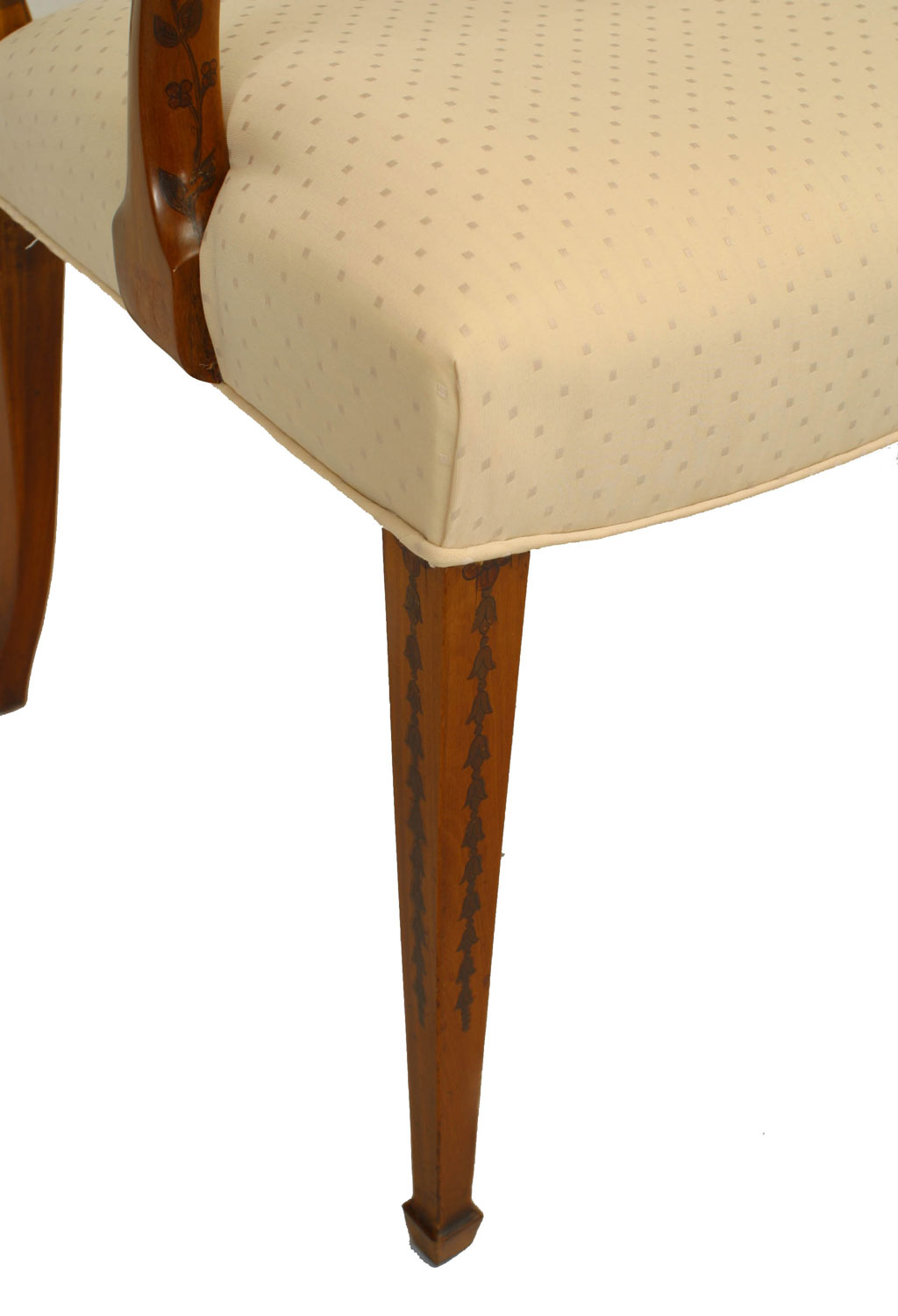 Style: English Materials & Techniques: Carved, satinwood, wood Category: Seating, Office/Library, Dining Room Condition: One side chair has small hole in seat upholstery towards back. Good; Wear consistent with age and use