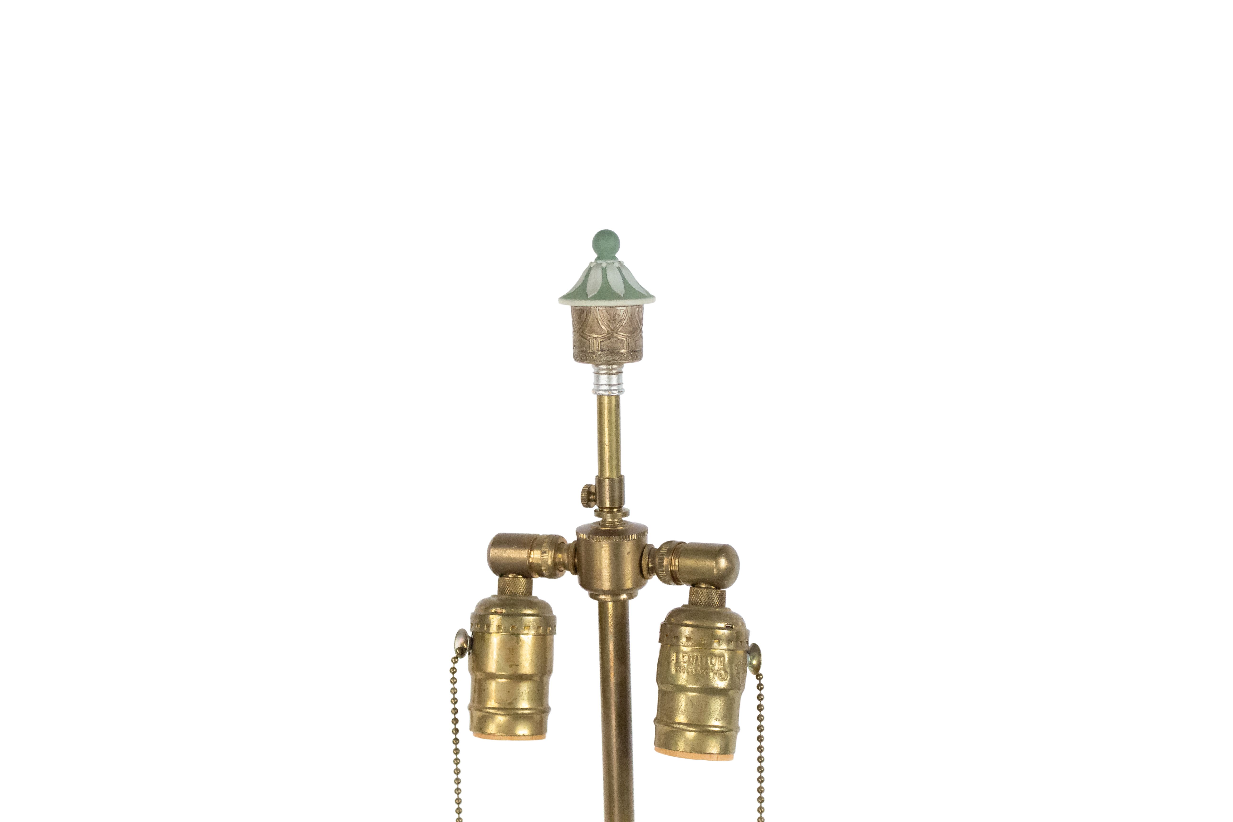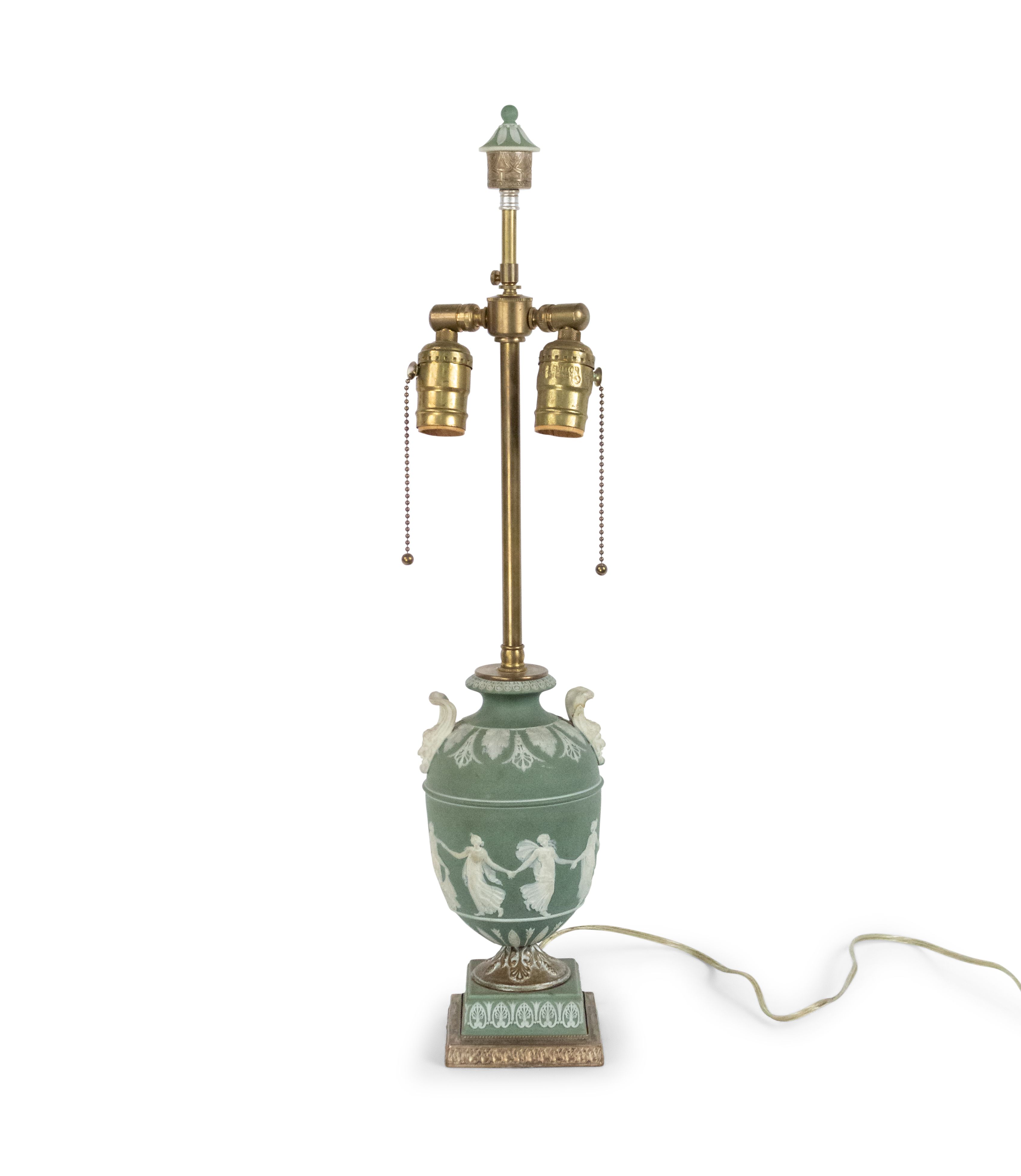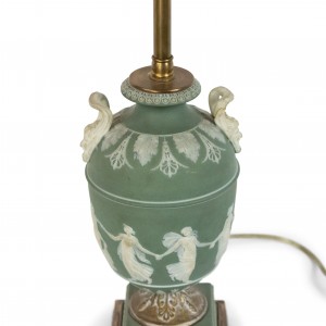 English Adam style (19th Century) green & white Wedgwood porcelain urn shaped table lamp with classical figures and handles.