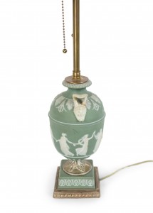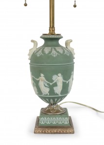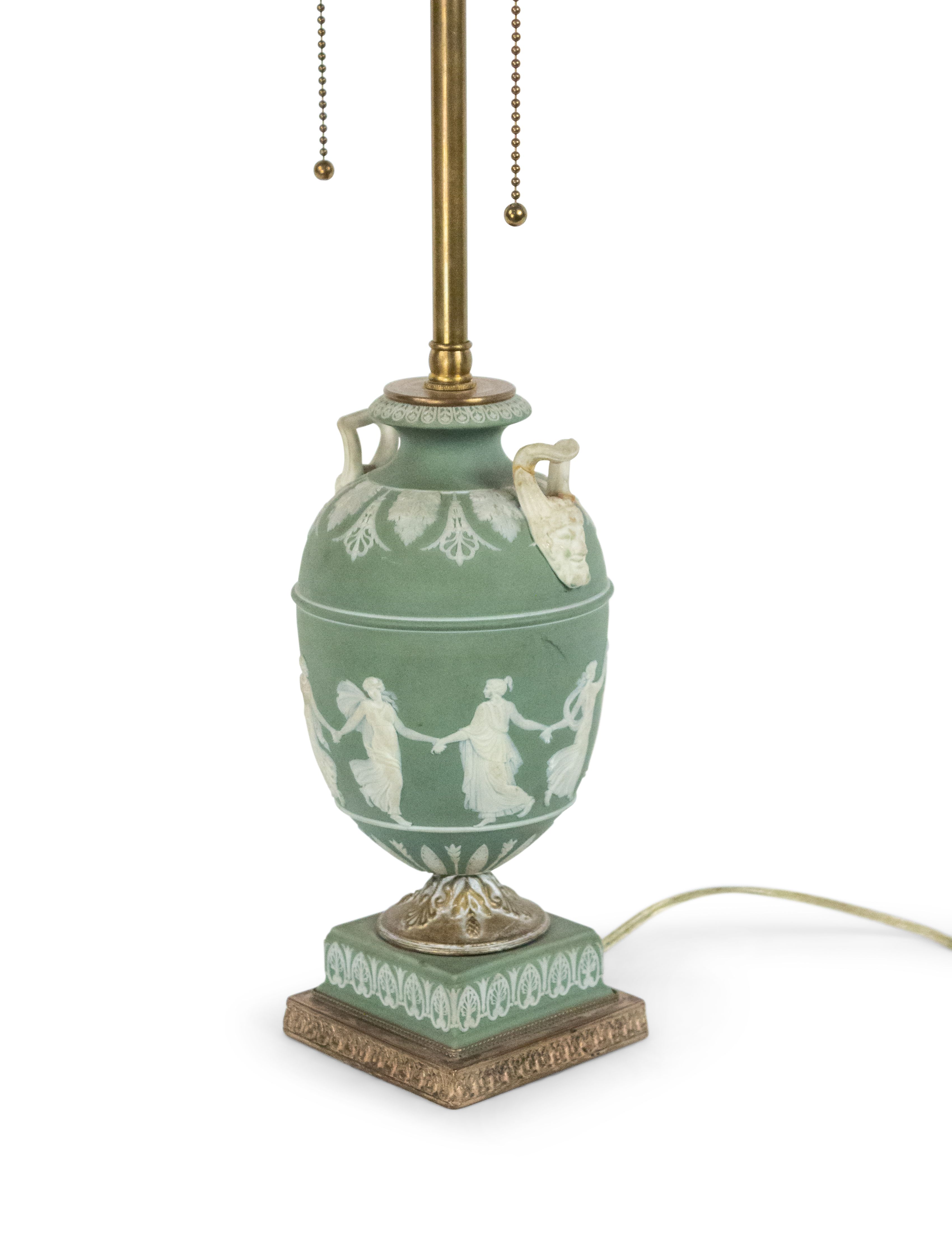 English Adam style (19th Century) green & white Wedgwood porcelain urn shaped table lamp with classical figures and handles..