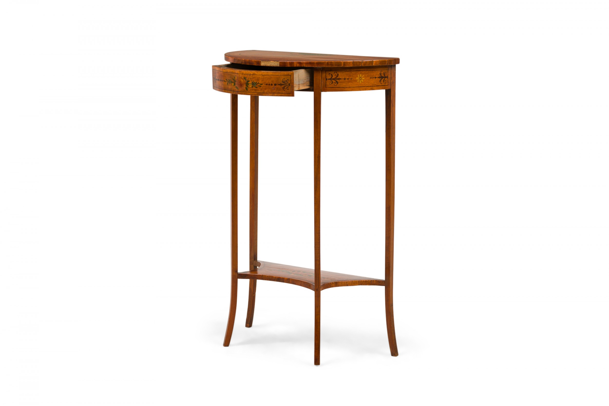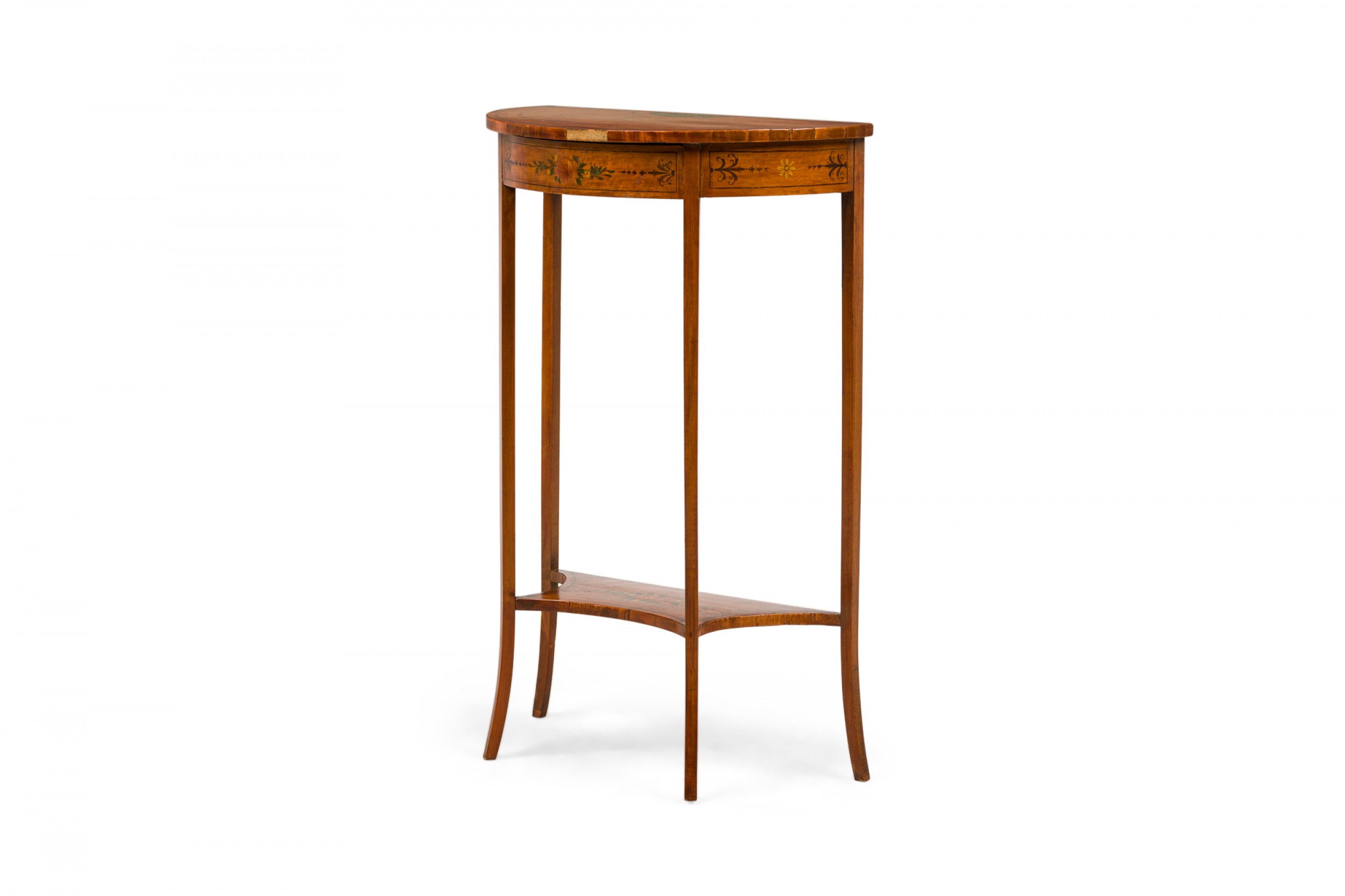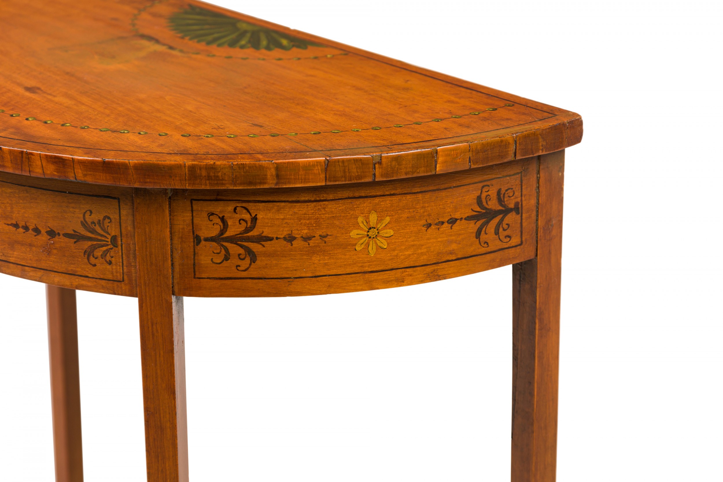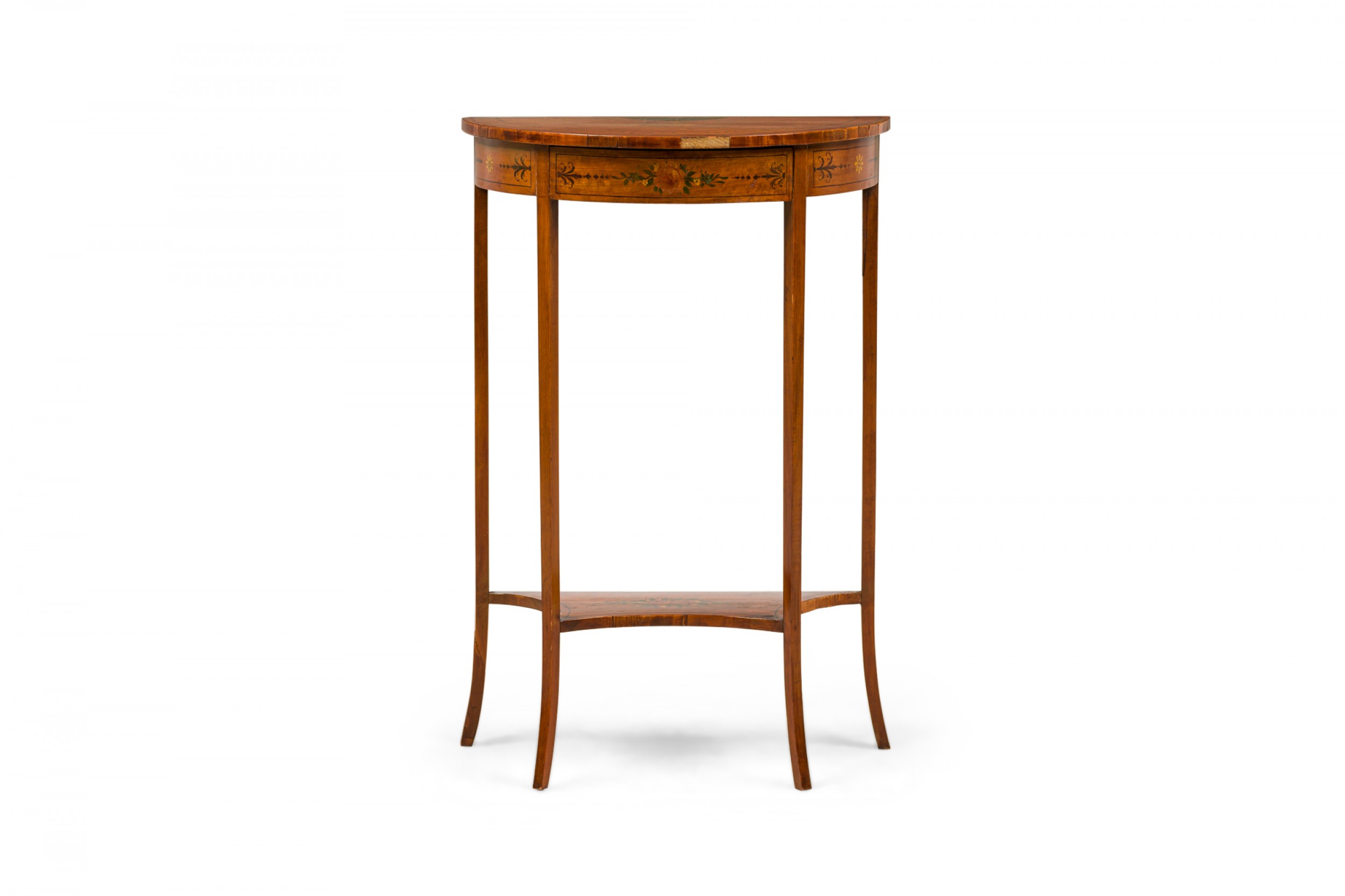 English Adam style (Edwardian 19/20th Century) satinwood console table in demilune form with central pullout drawer, painted floral embellishments, and concave stretcher shelf uniting four slightly splayed legs..