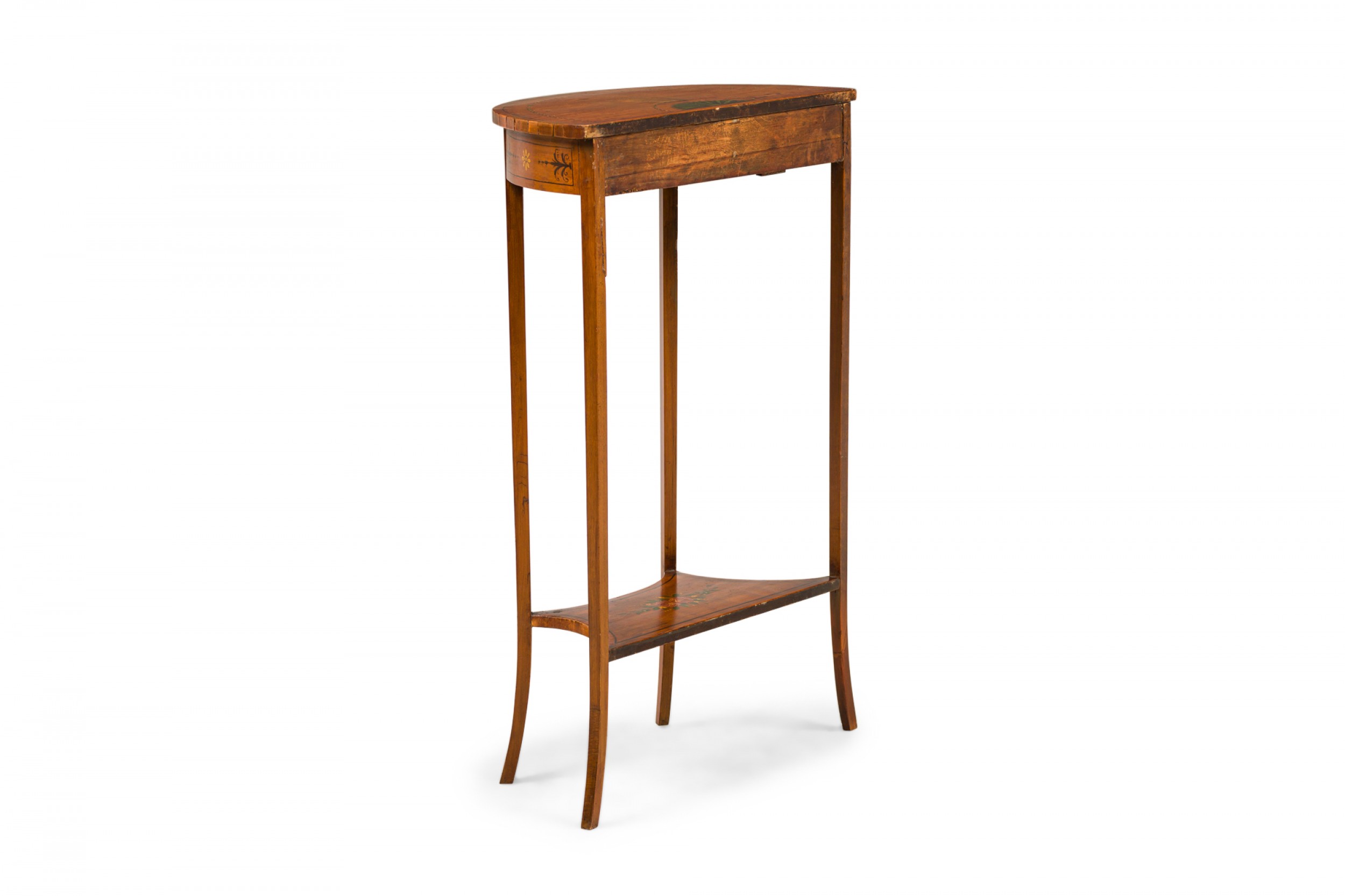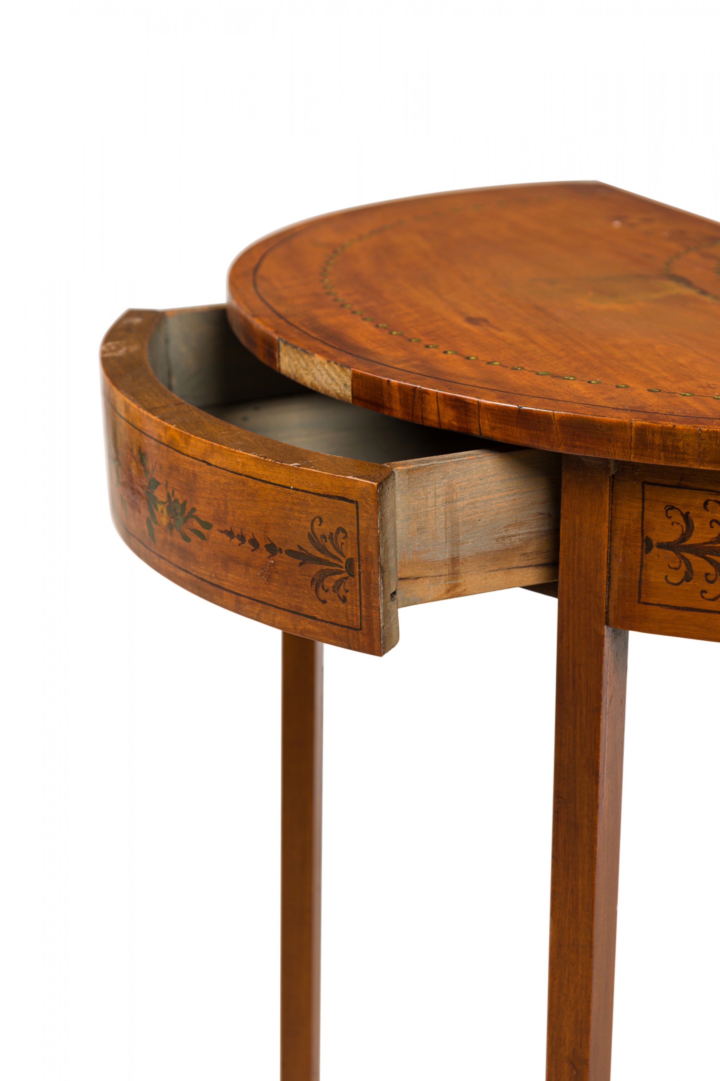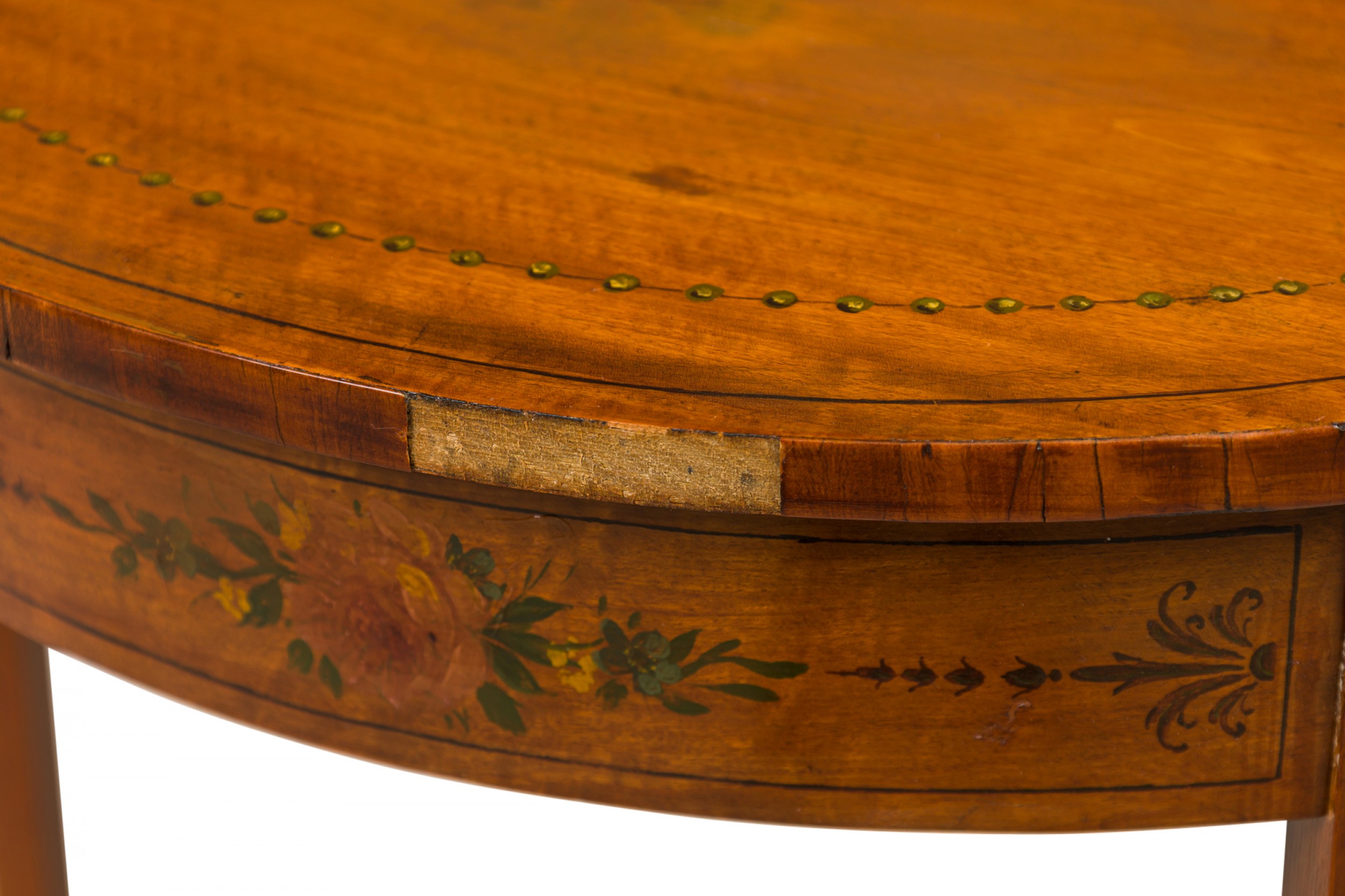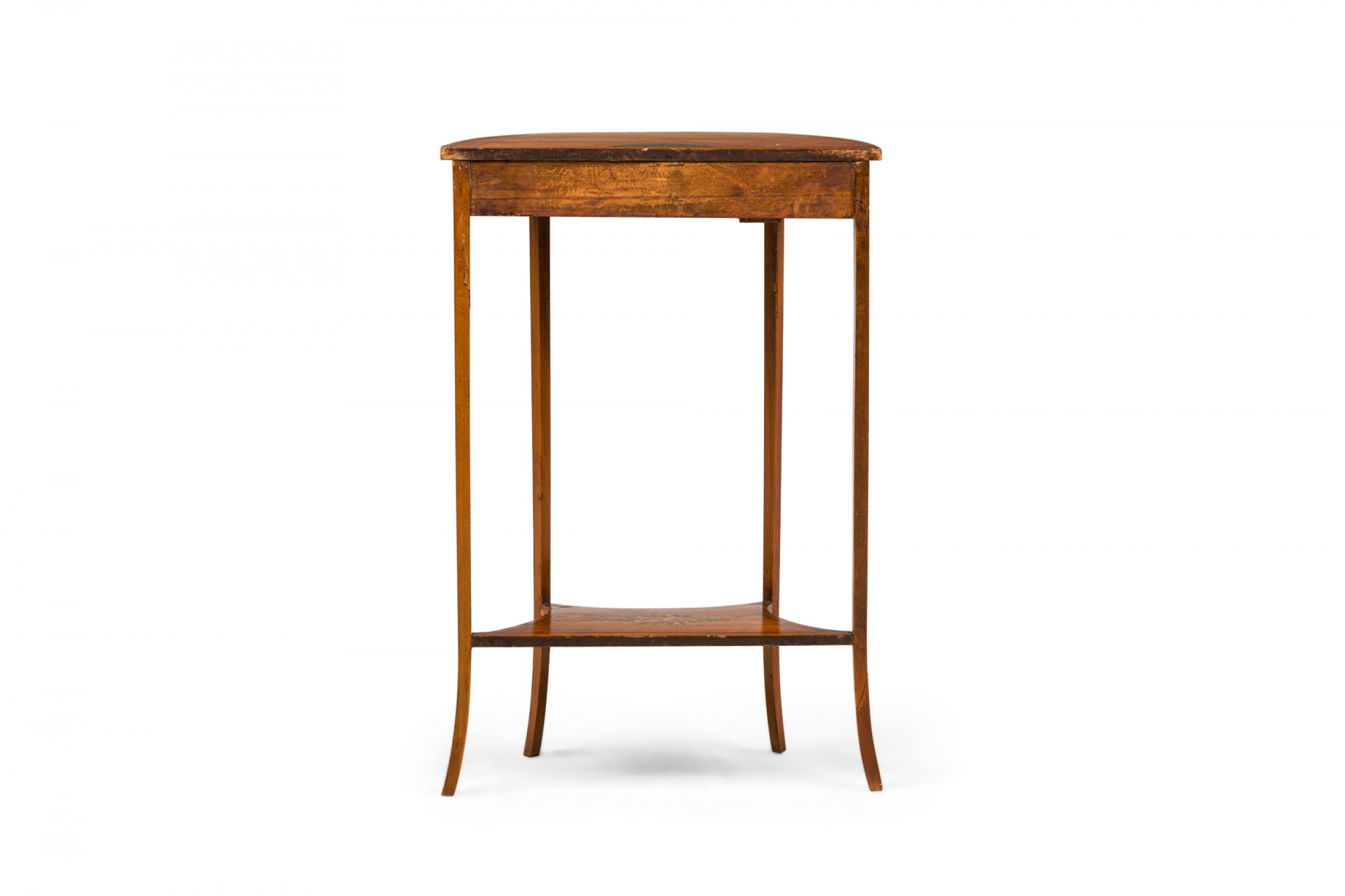English Adam style (Edwardian 19/20th Century) satinwood console table in demilune form with central pullout drawer, painted floral embellishments, and concave stretcher shelf uniting four slightly splayed legs..