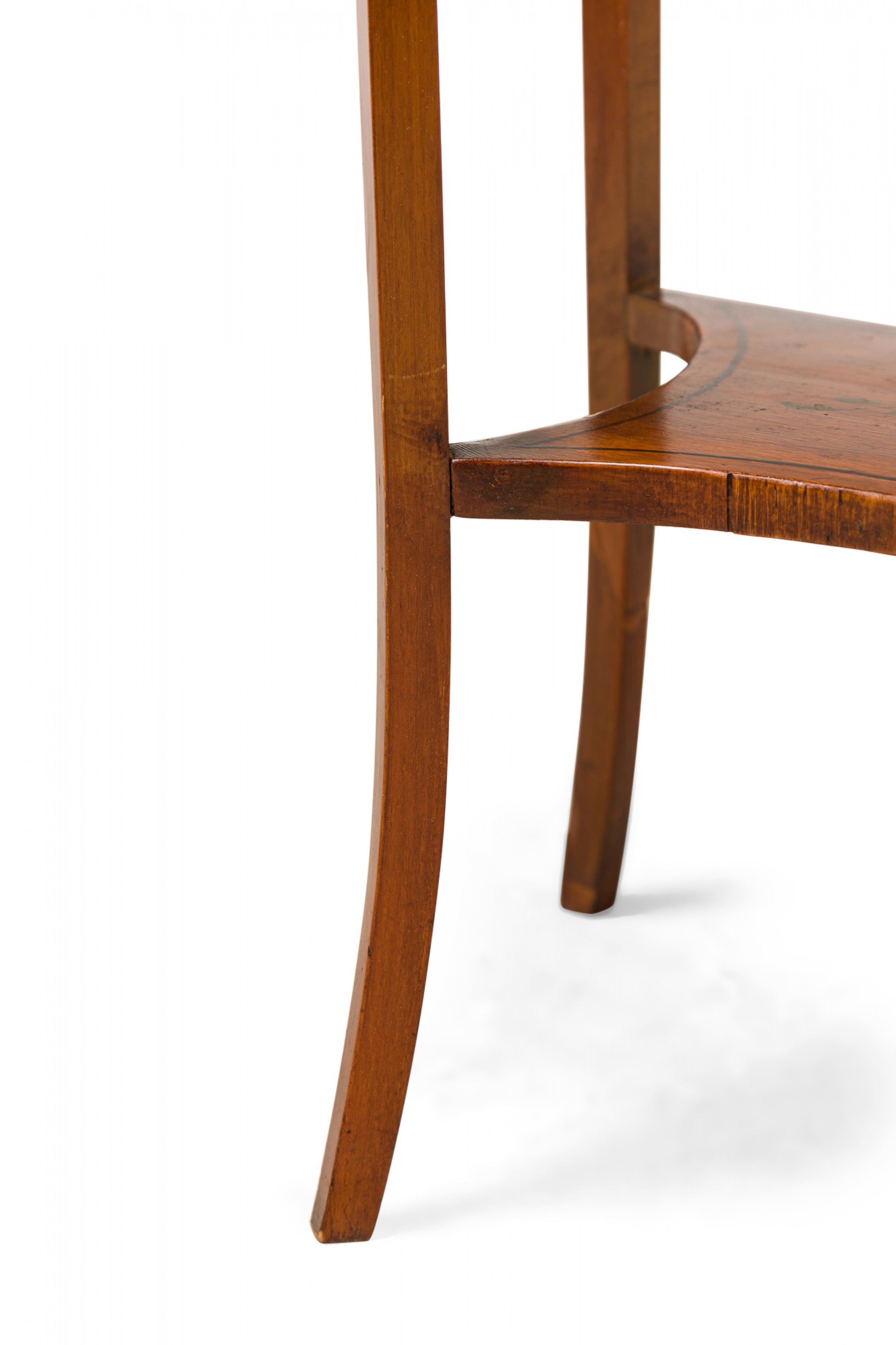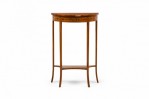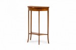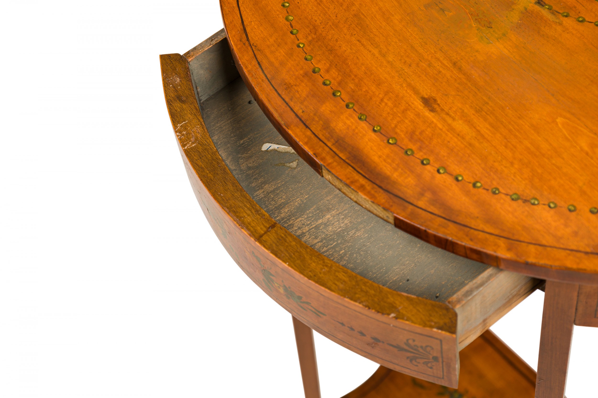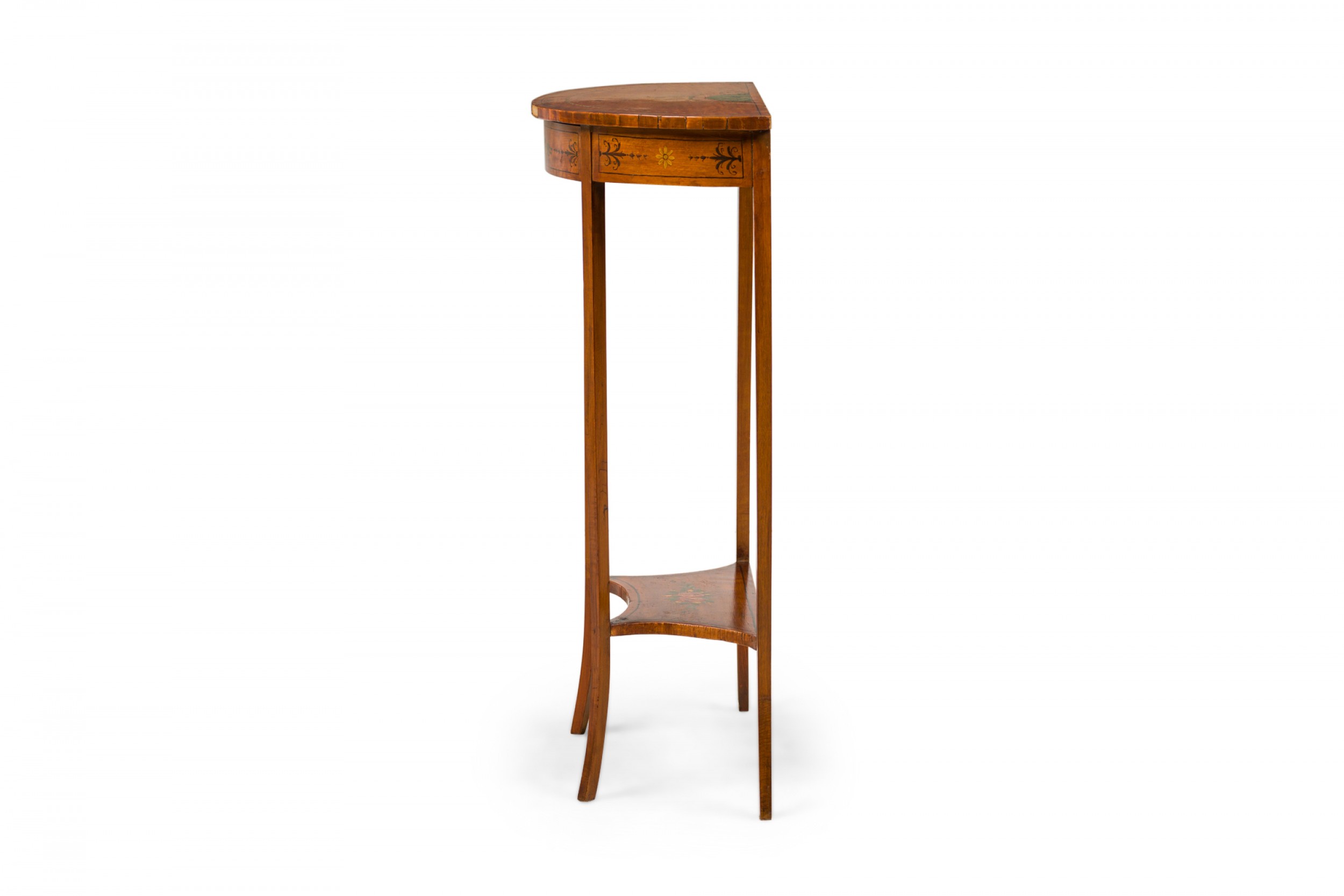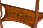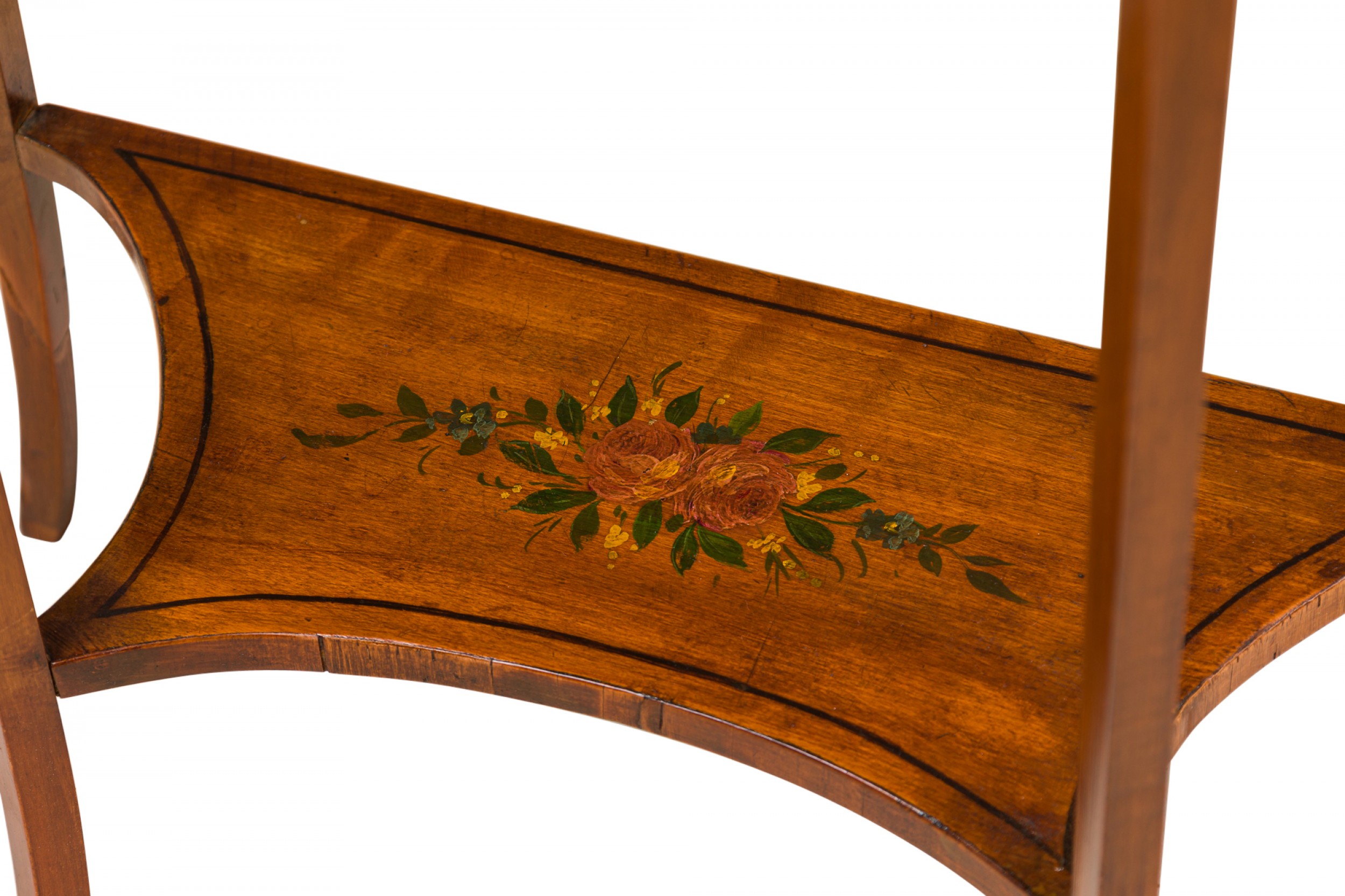English Adam style (Edwardian 19/20th Century) satinwood console table in demilune form with central pullout drawer, painted floral embellishments, and concave stretcher shelf uniting four slightly splayed legs..