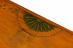 English Adam style (Edwardian 19/20th Century) satinwood console table in demilune form with central pullout drawer, painted floral embellishments, and concave stretcher shelf uniting four slightly splayed legs.