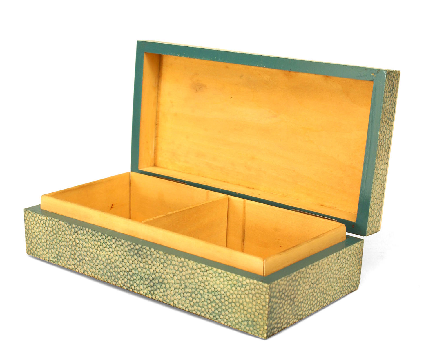 English Art Deco light green shagreen rectangular box with bone edging at the top.
