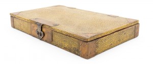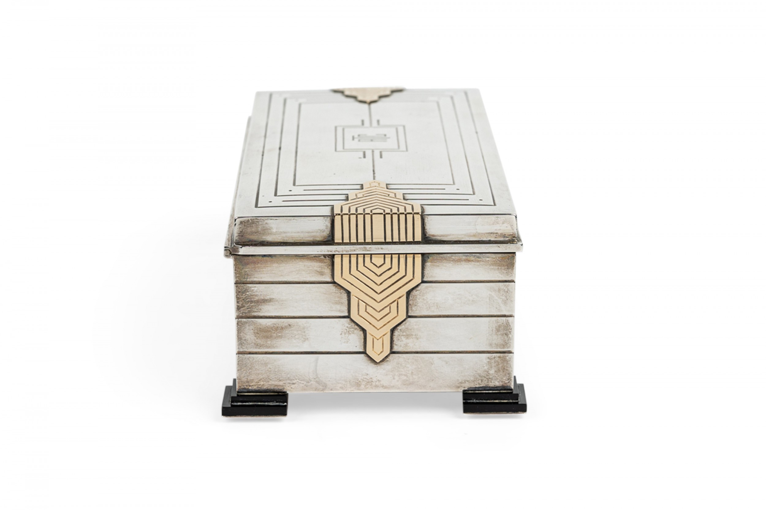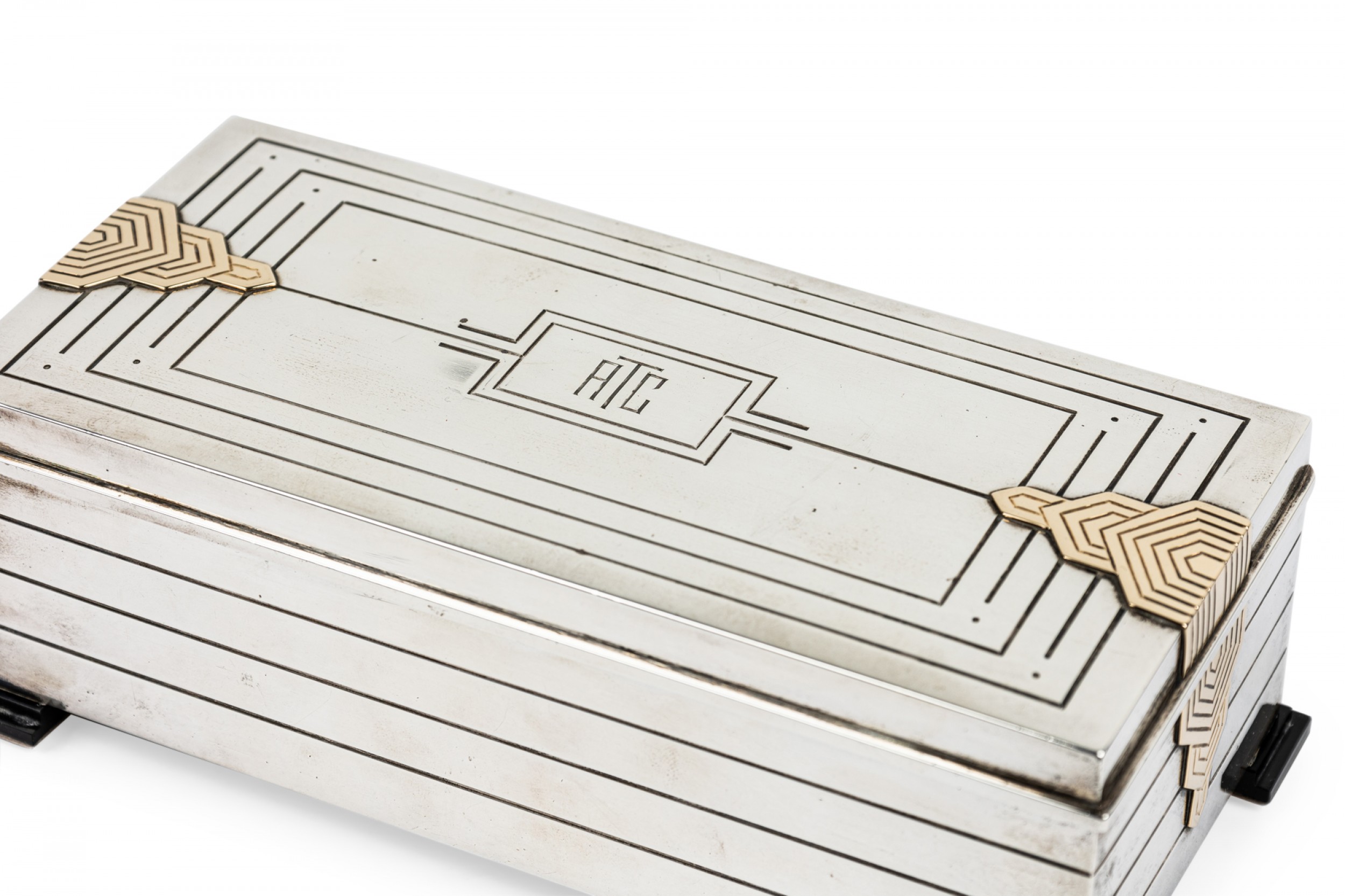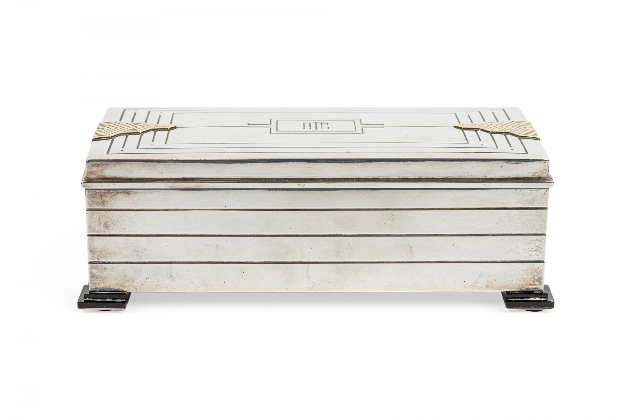 English Art Deco sterling silver rectangular box with fluted design and 14 caret geometric trimmed design on sides with initials: ATC on top.