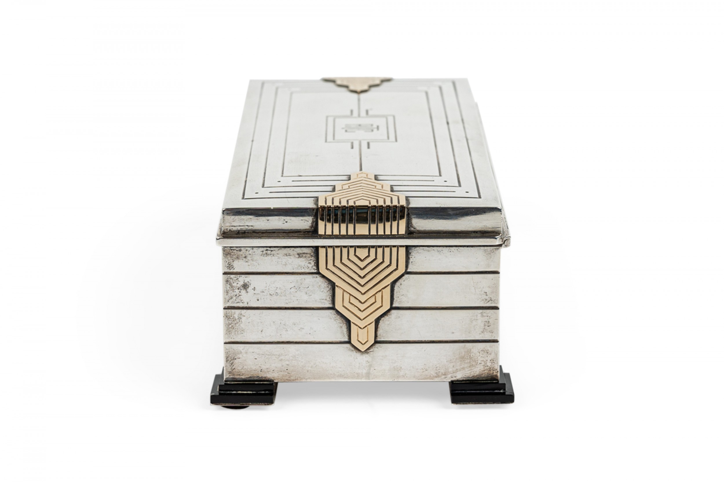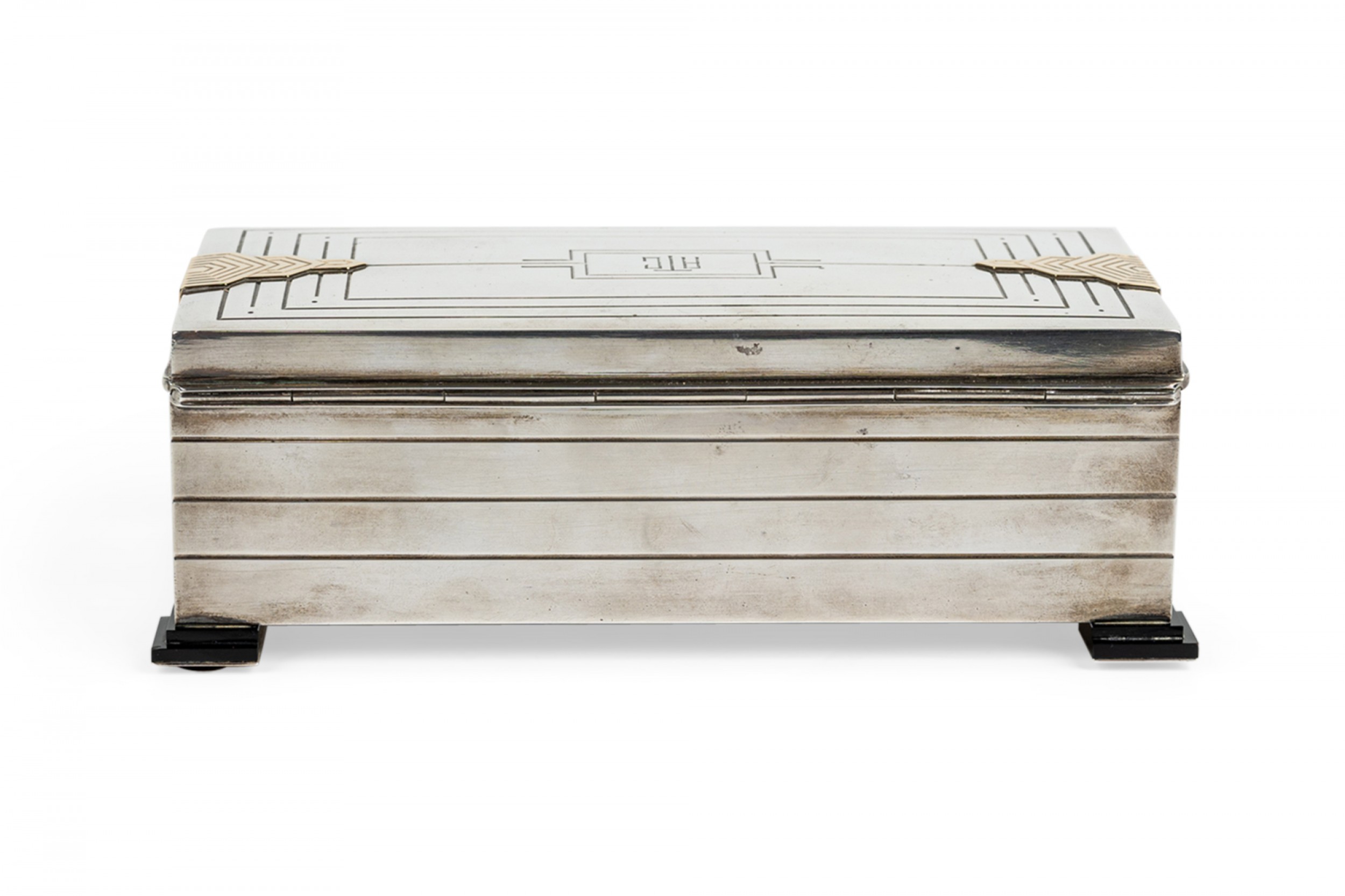 English Art Deco sterling silver rectangular box with fluted design and 14 caret geometric trimmed design on sides with initials: ATC on top..