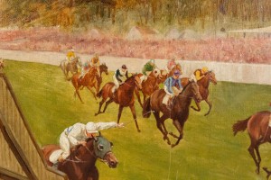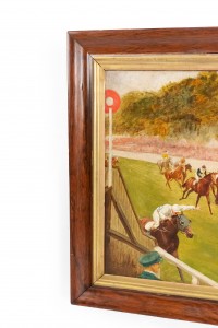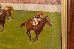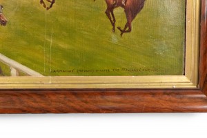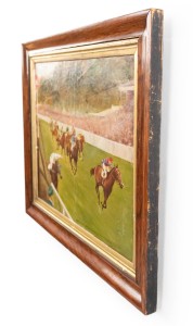 English Art Moderne (Mid 20th Cent) oil painting of Stewart's Cup horse race in rosewood frame.