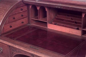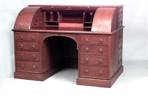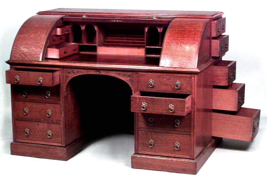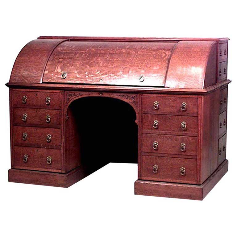 English Arts and Crafts oak roll top desk with side drawers and leather top.