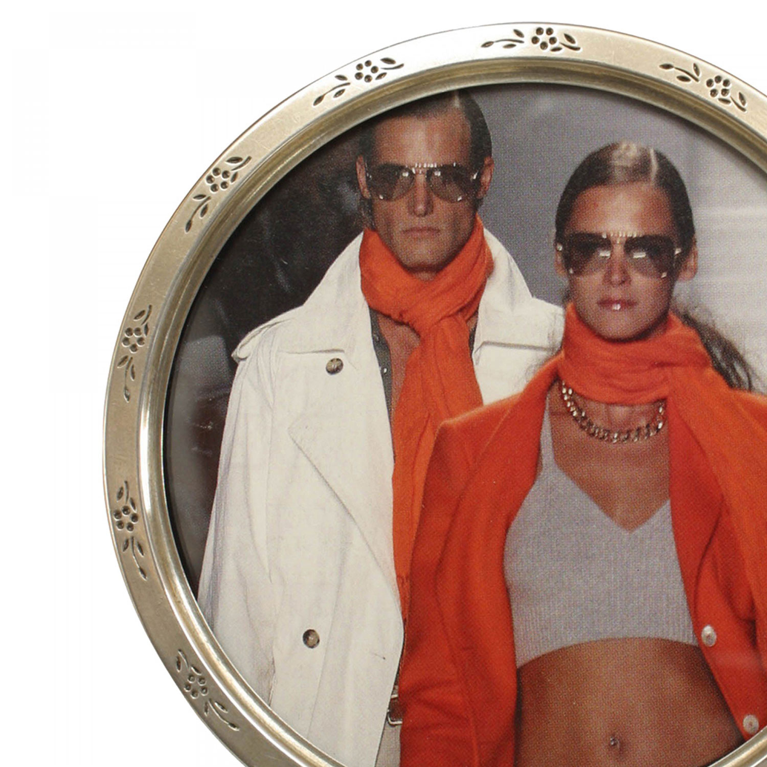 English Arts and Crafts sterling silver round easel picture frame with simple floral etched design and shaped ring top with teal velvet backing..