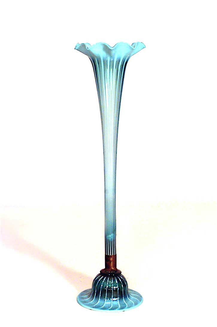 English Arts & Crafts blue glass trumpet shaped vase with fluted design and scalloped top (James Powell & Son/Whitefriars Glassworks).