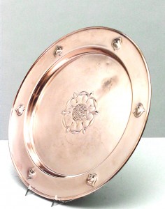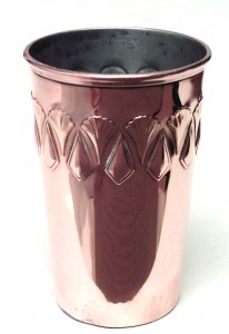 English Arts and Crafts copper and brass trimmed pitcher with matching set of 6 cups and round tray with heart shaped decoration.