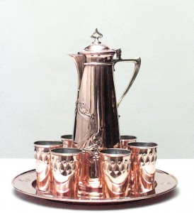 English Arts and Crafts copper and brass trimmed pitcher with matching set of 6 cups and round tray with heart shaped decoration..