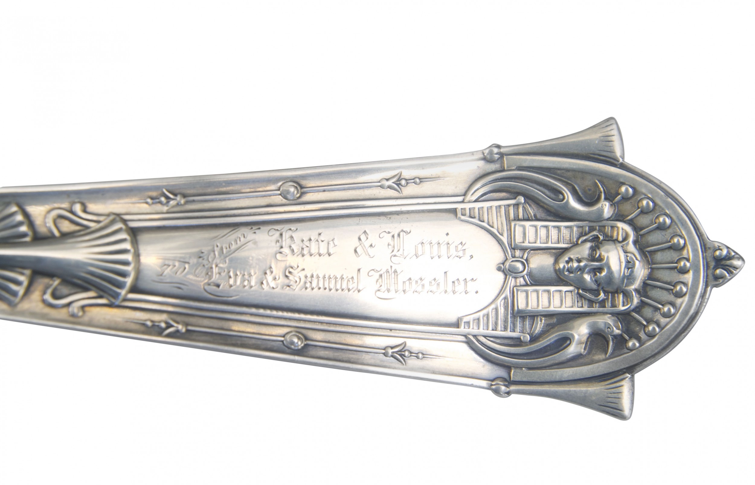Set of 9 various English Arts & Crafts Egyptian Revival sterling silver spoons with sphinx head & fan design (ladle, cake knife, 7 various small spoons) marked B. F. Norris & Co-1872).