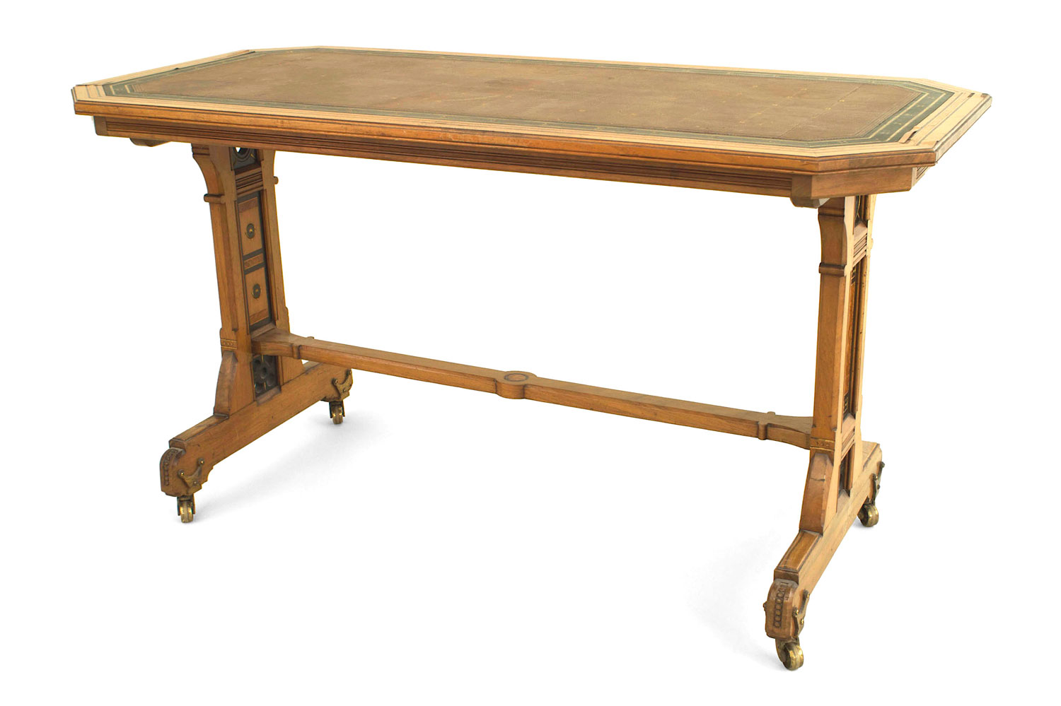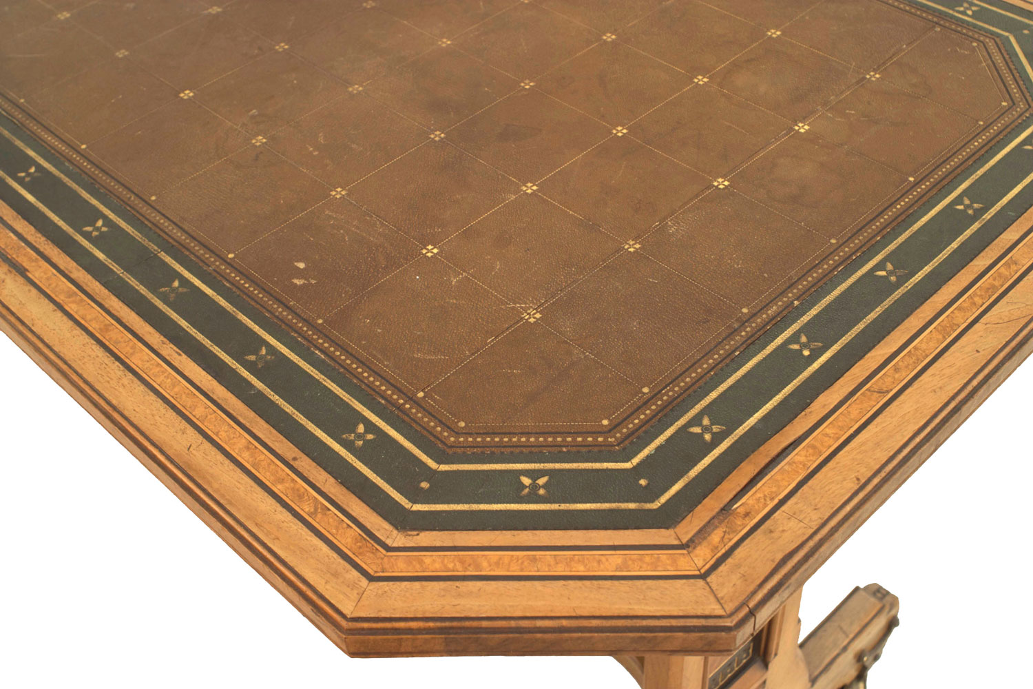 English Arts & Crafts (Aesthetic Movement) double pedestal table elm and burl wood desk with a canted corner top having multi-wood inlay and a green & brown leather writing surface..