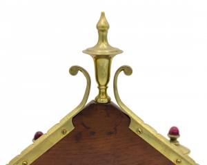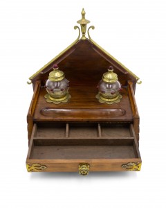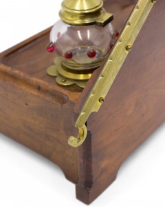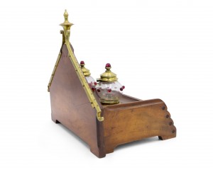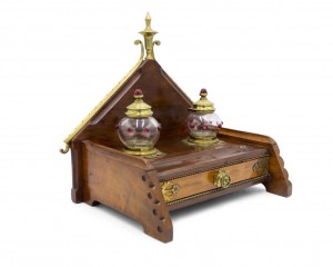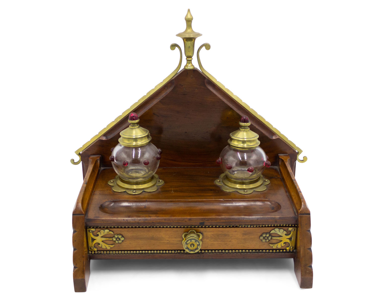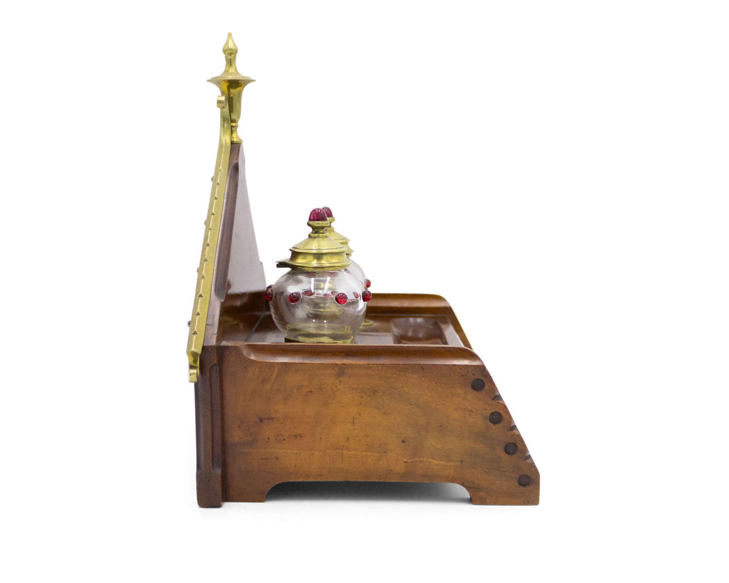 English Arts & Crafts (Gothic Revival-style) mahogany and brass trimmed double inkwell with glass jewels and drawer.