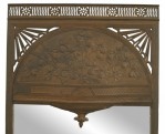 English Arts & Crafts iron mirror with a pierced frame surrounding a floral scene.