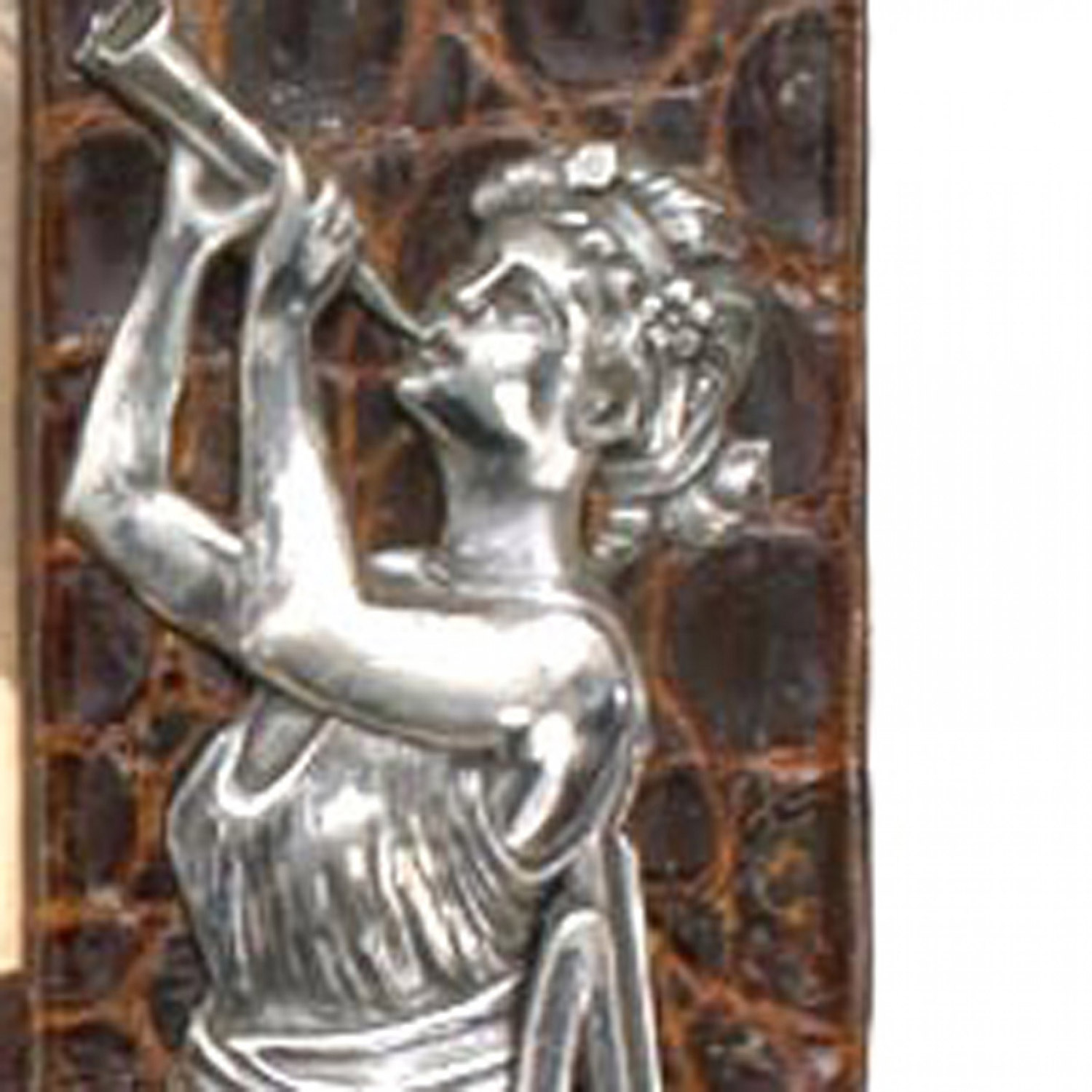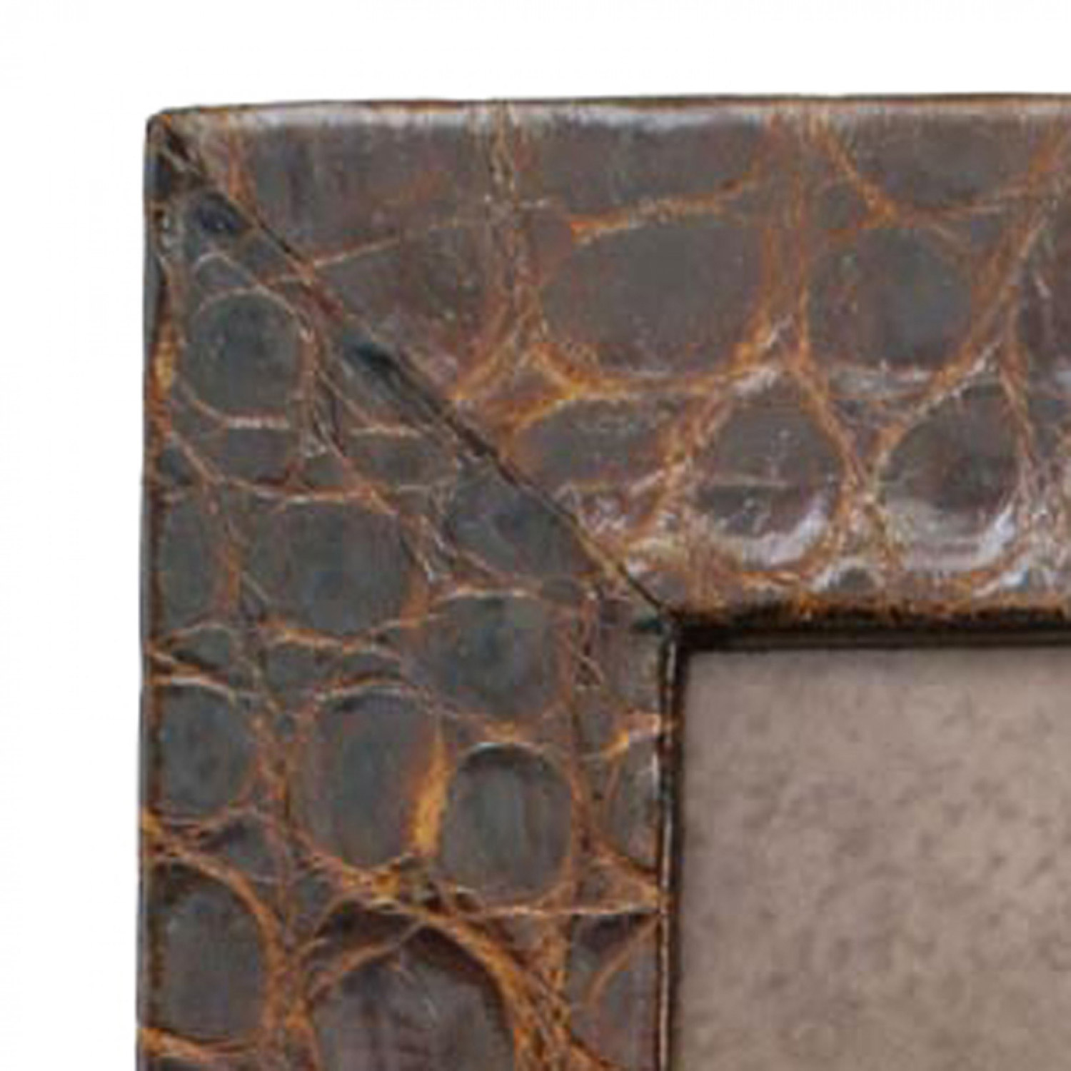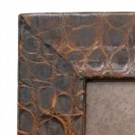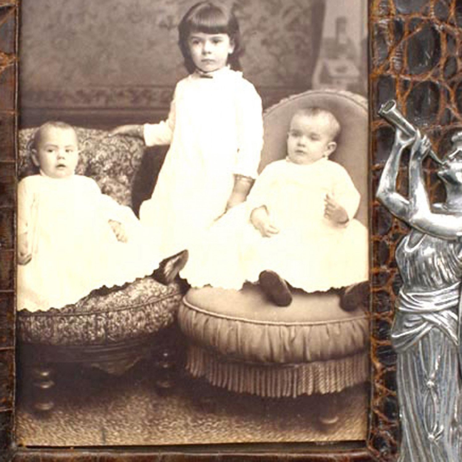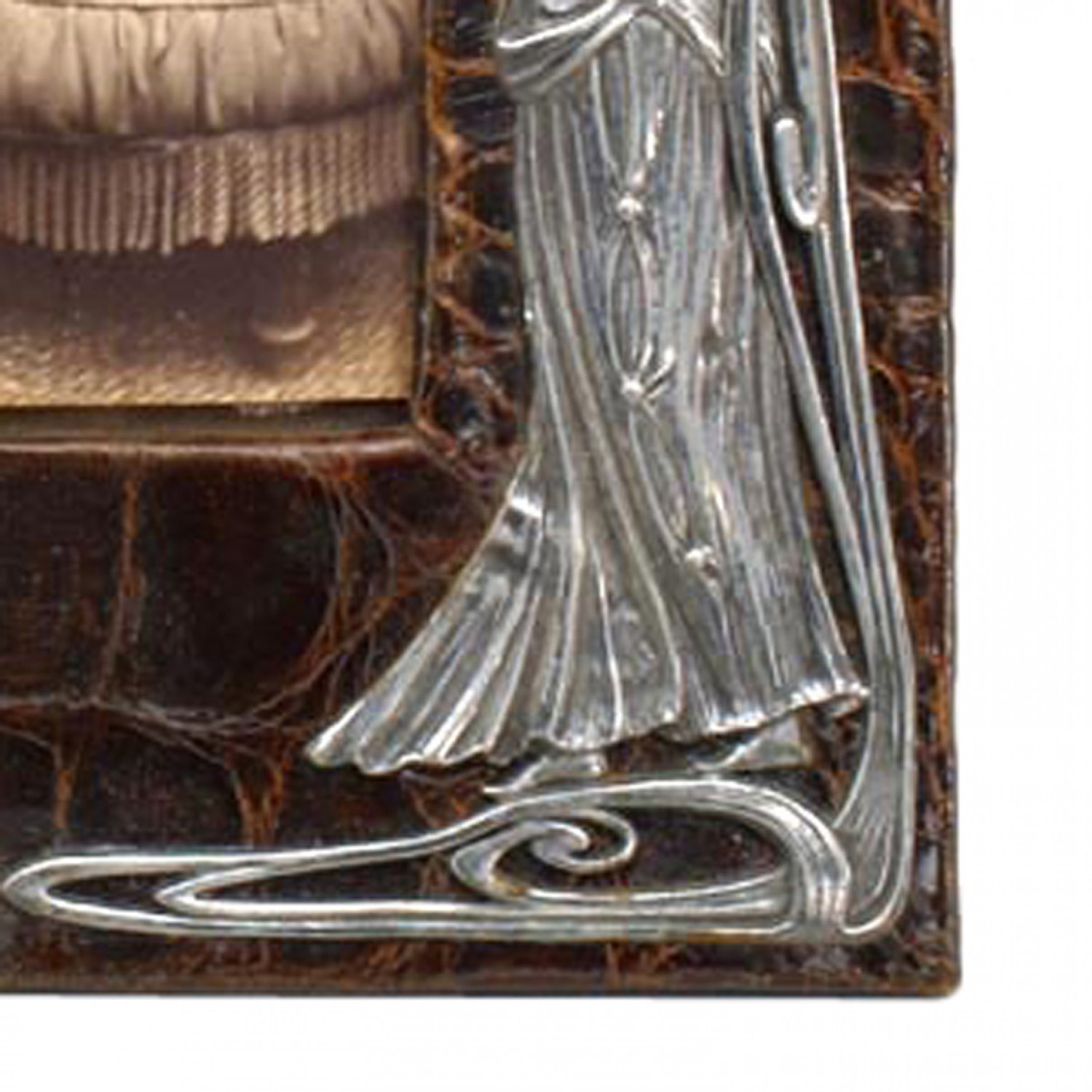 English dark brown crocodile easel picture frame with pewter Art Nouveau style female figure.