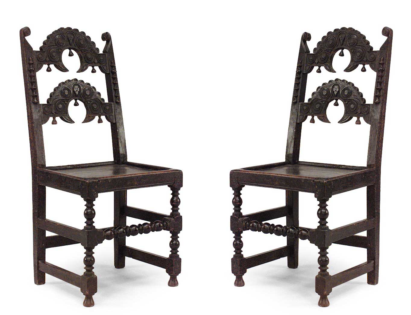 SET of 4 English Charles II style (19th Century) oak Derbyshire side chairs with 2 horizontal arched splats above turned legs joined by stretchers (PRICED AS SET).