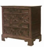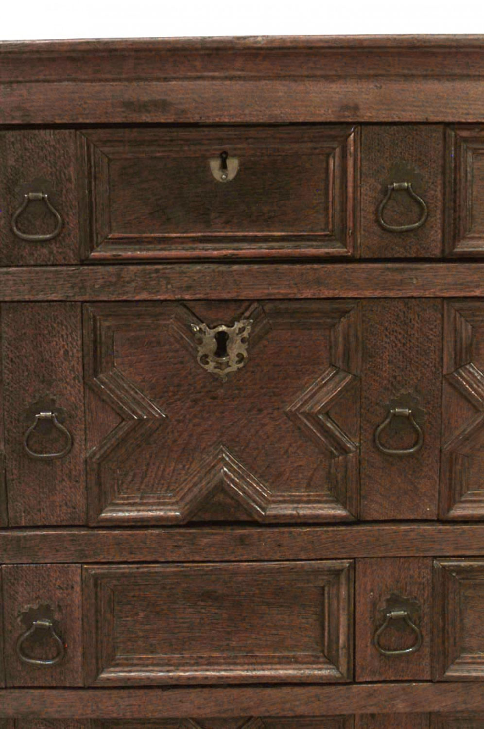 English Jacobean style (17th Century elements or later) oak chest of drawers with 4 geometric fronted drawers above an apron on bracket feet.