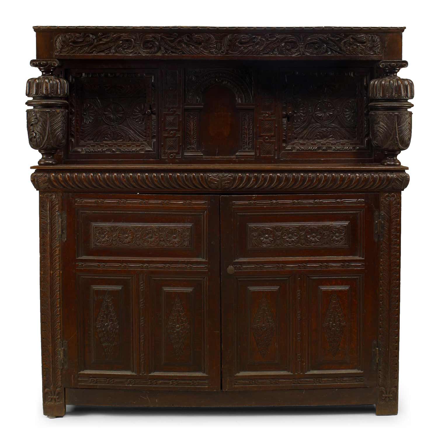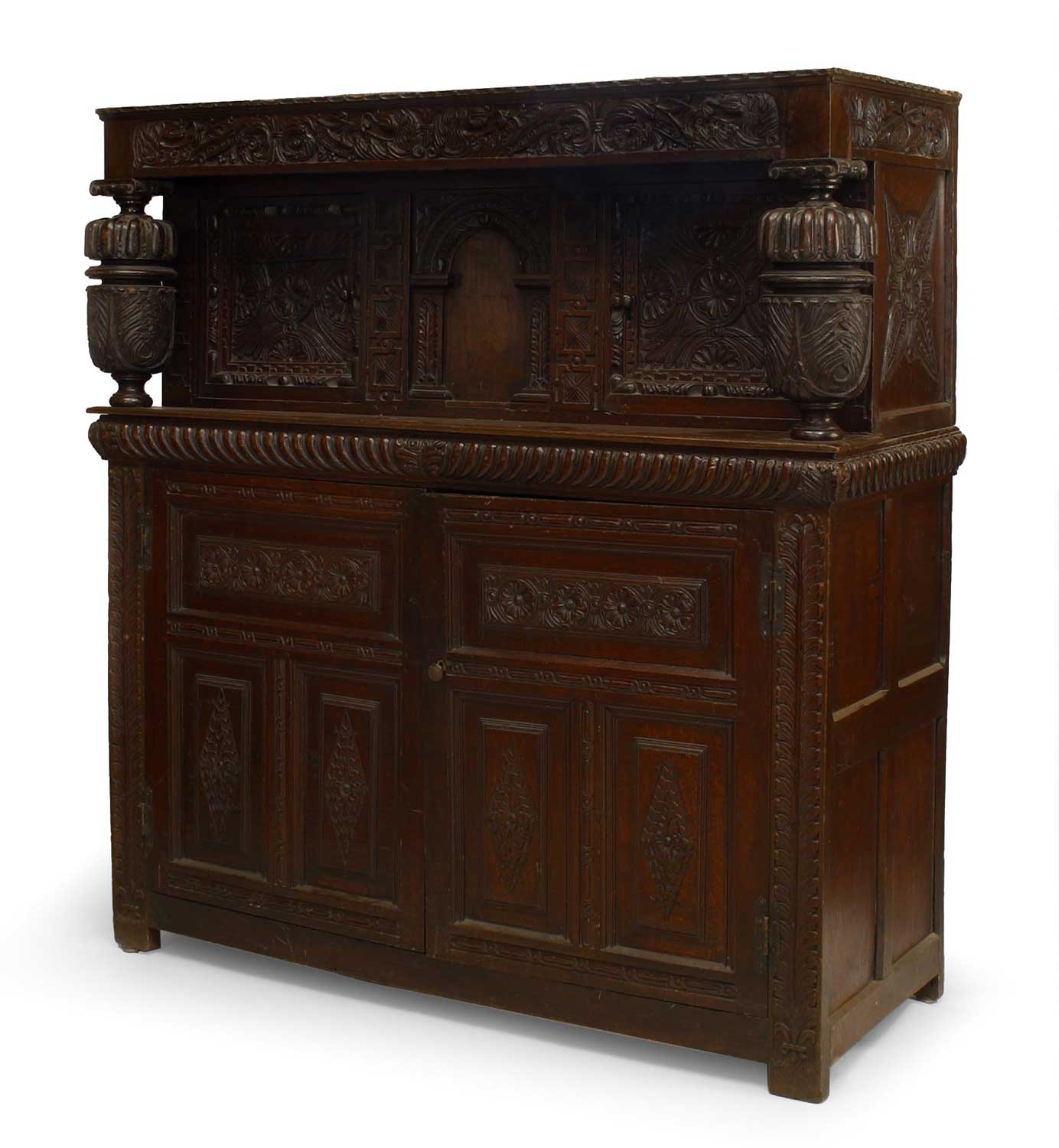 English Charles II-style (17th Century and Later) oak court cupboard of paneled construction with a pair of doors behind baluster uprights over another pair of doors