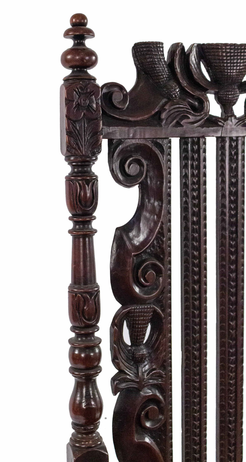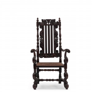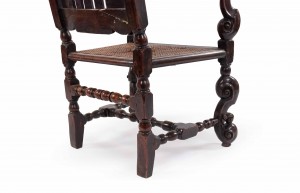 Style: English Materials & Techniques: Walnut, slat Category: Seating Condition: Caning in middle of seat is broken but wooden base is stable.