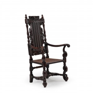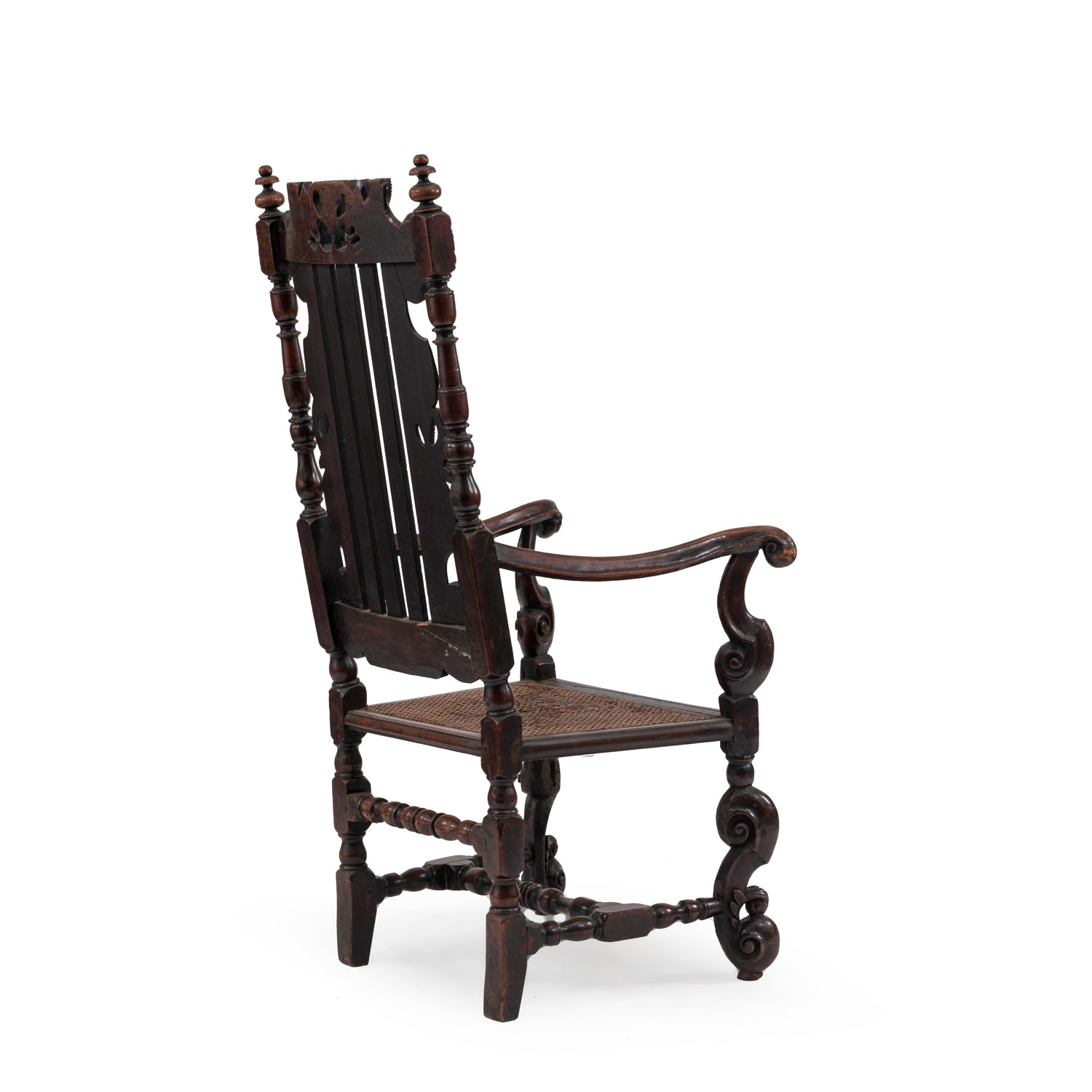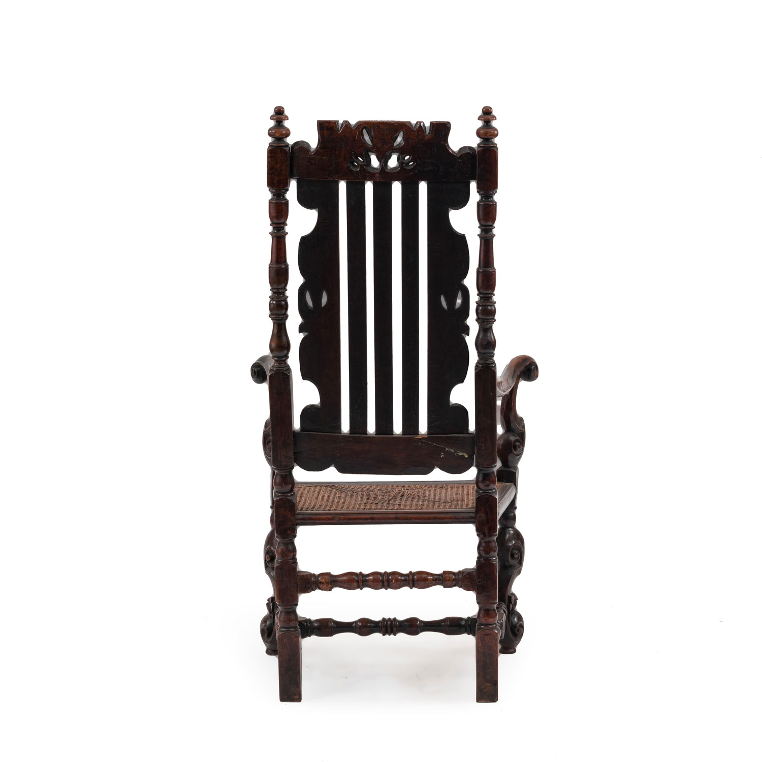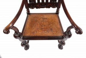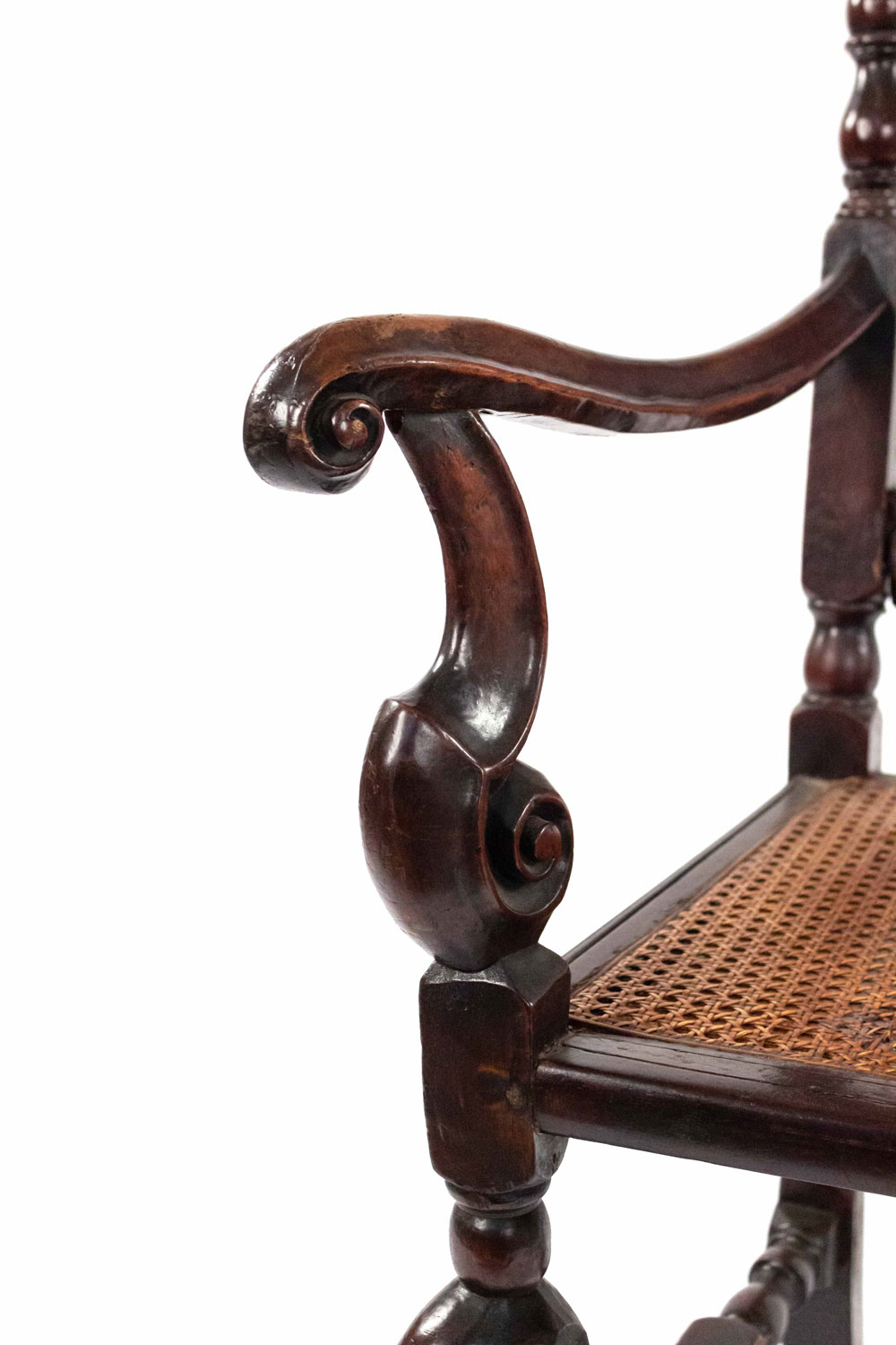English Charles II style caned & walnut arm chair with vertically slatted back above S scroll legs joined by a stretcher. (19th Cent & possibly with earlier elements)