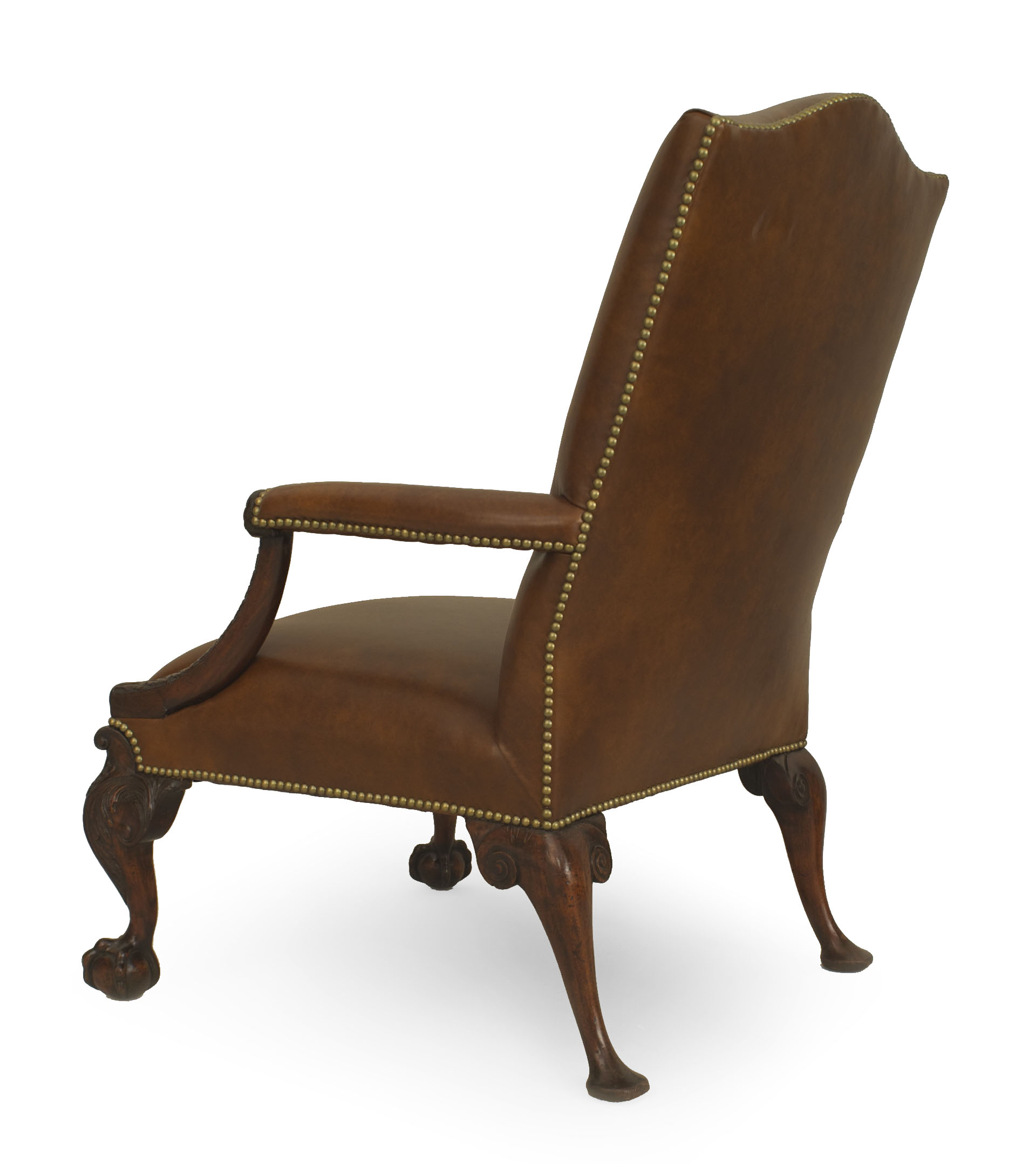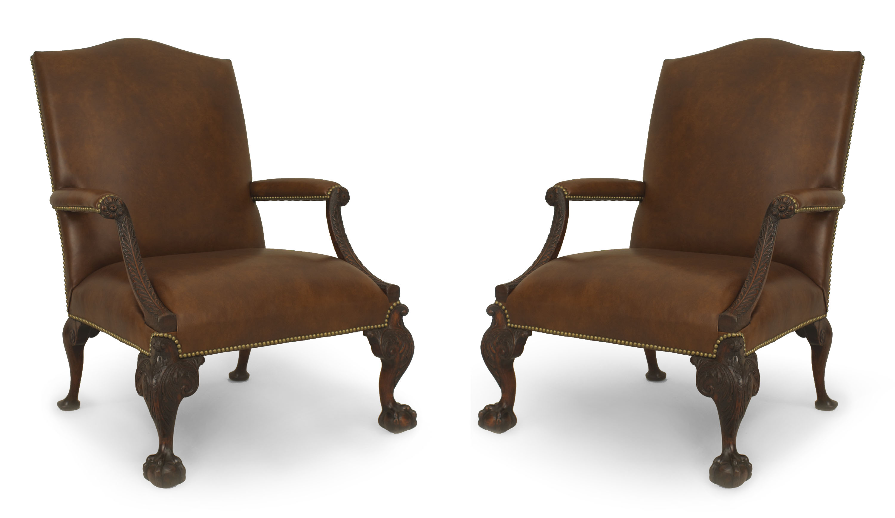 PAIR of English Chippendale (18th Cent) large Gainsborough carved open arm library chairs with shaped arm rests and back upholstered in brown leather