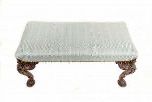 English Chippendale style (19th Century) rectangular carved mahogany bench with blue upholstery.