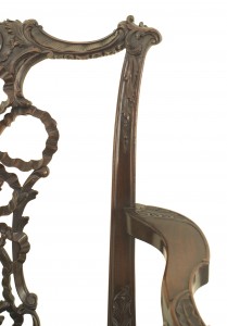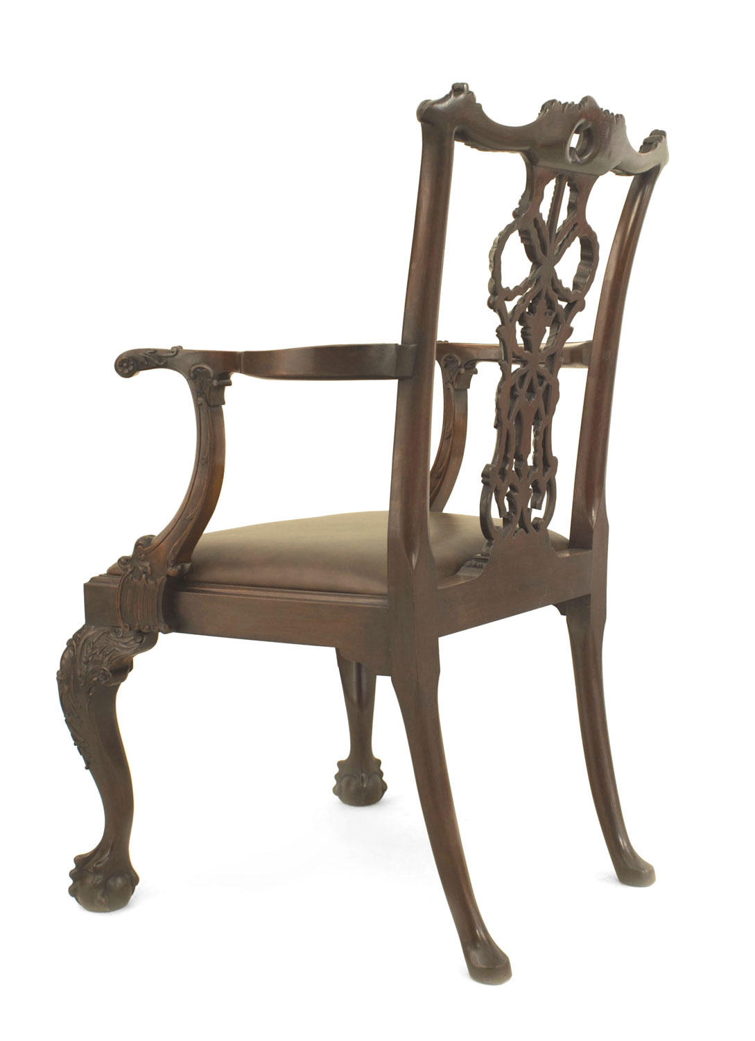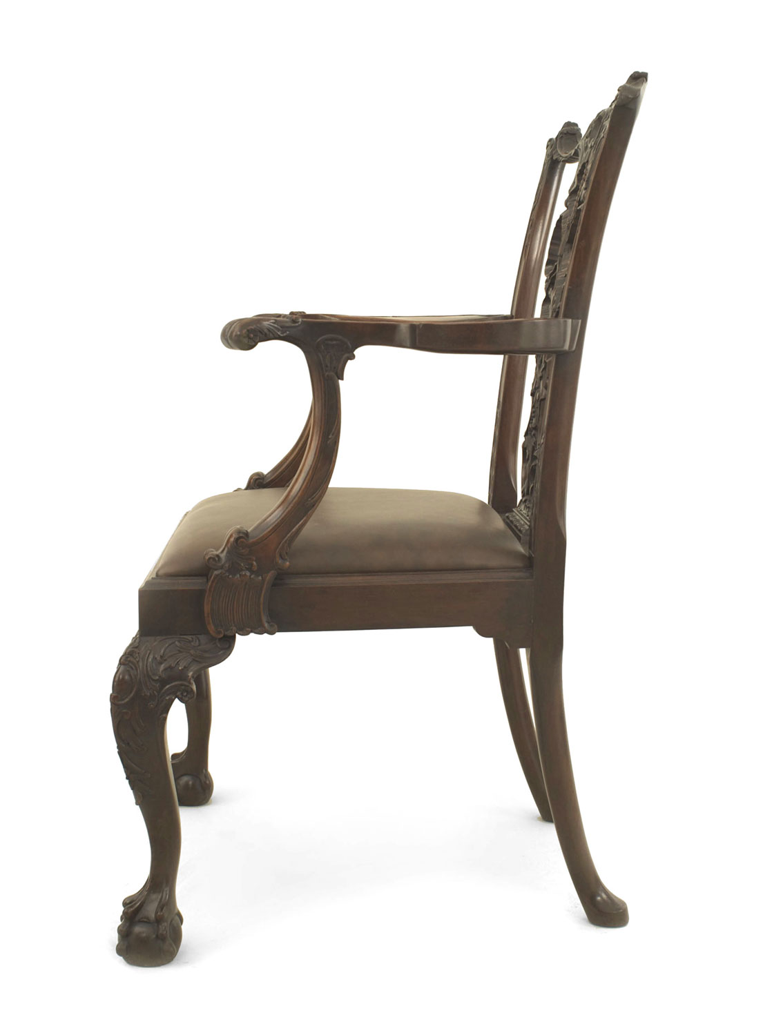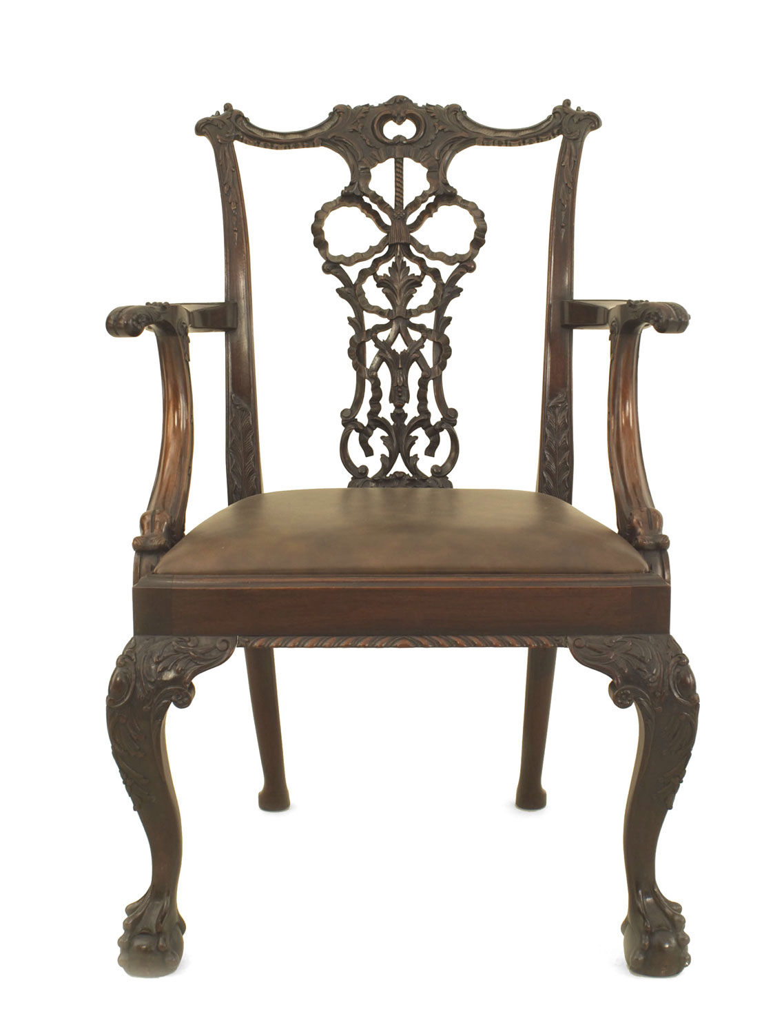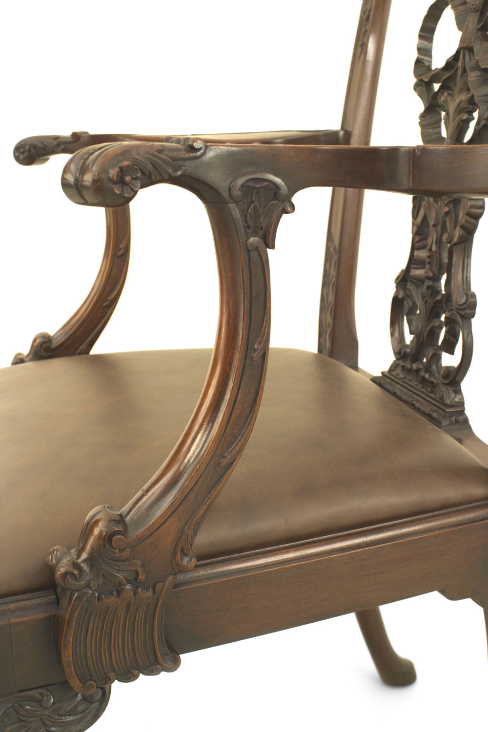 SET of 8 English Chippendale style (late 19th Cent) chairs with a carved ribbon back design & new brown leather slip seat. (2 arms-26"w 24.5"d 41'h, 6 sides (att: GILLOWS)