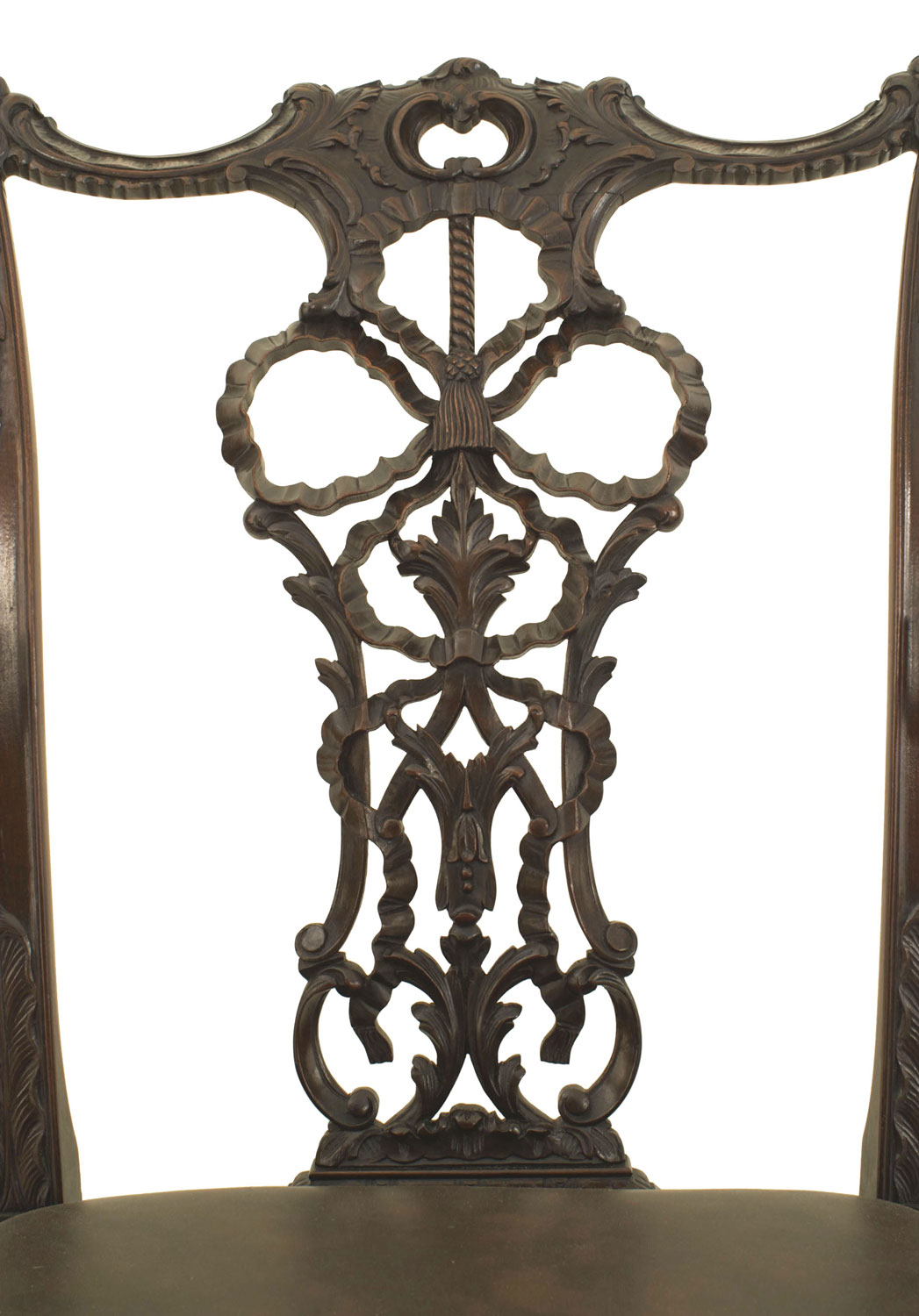 SET of 8 English Chippendale style (late 19th Cent) chairs with a carved ribbon back design & new brown leather slip seat. (2 arms-26"w 24.5"d 41'h, 6 sides (att: GILLOWS).