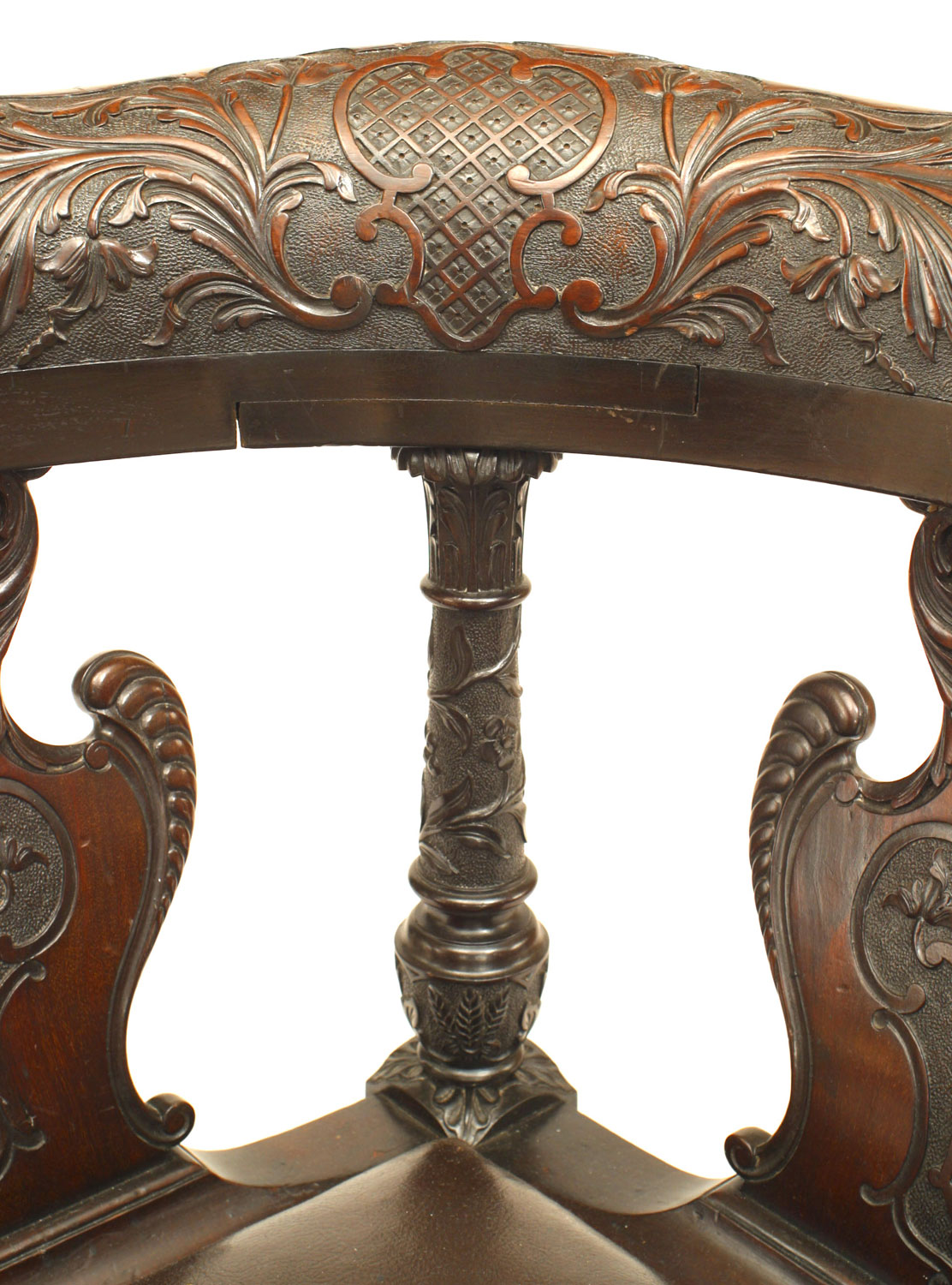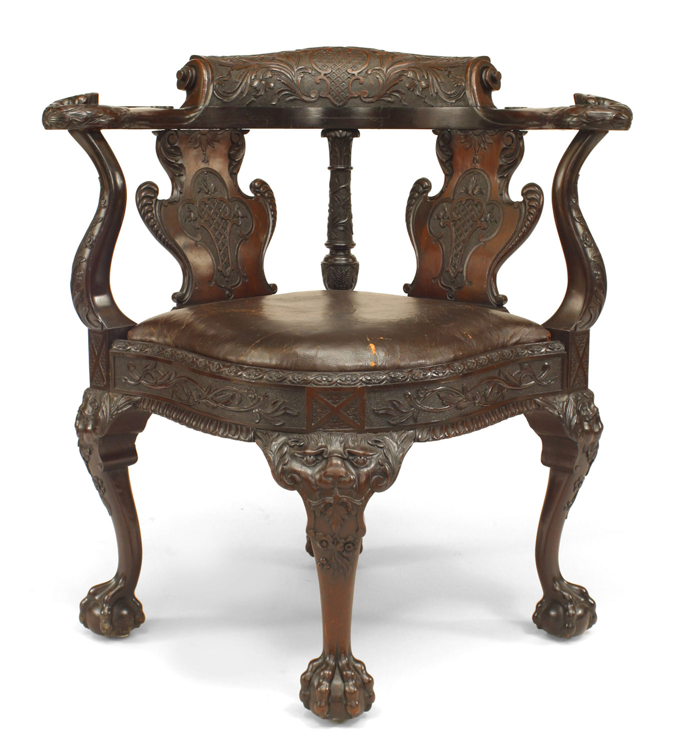 English Chippendale style (19th Century) carved mahogany double shield splat back corner arm chair with brown leather seat..