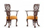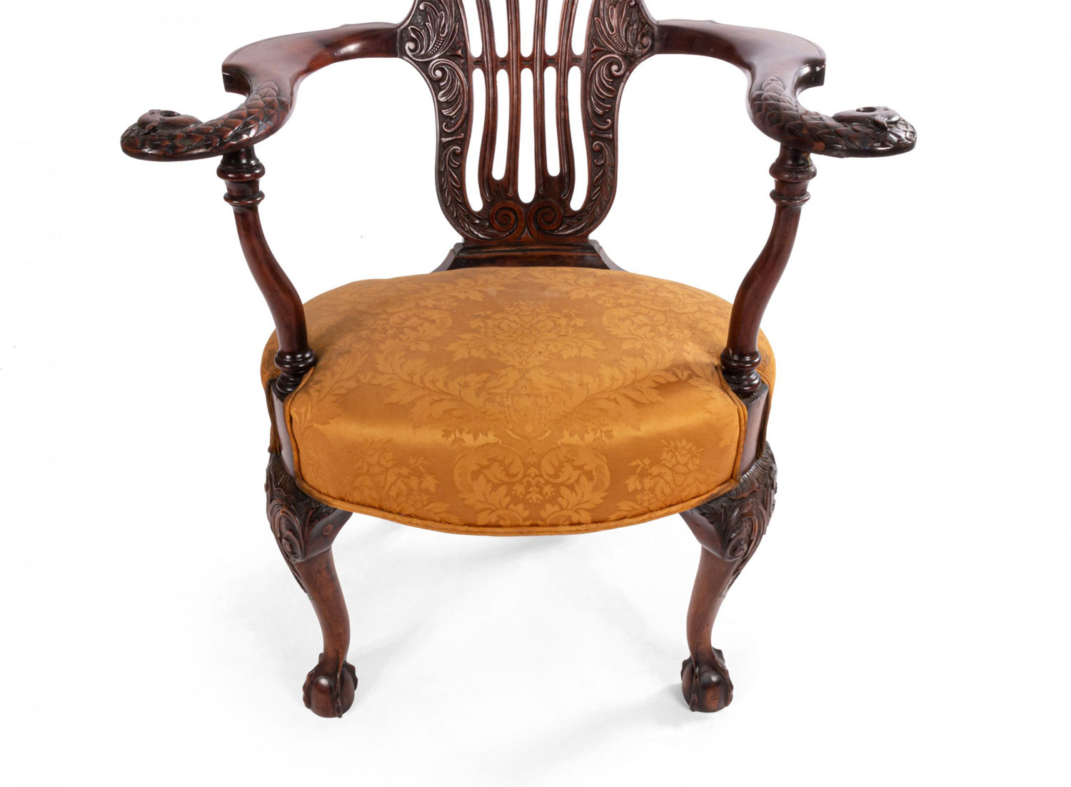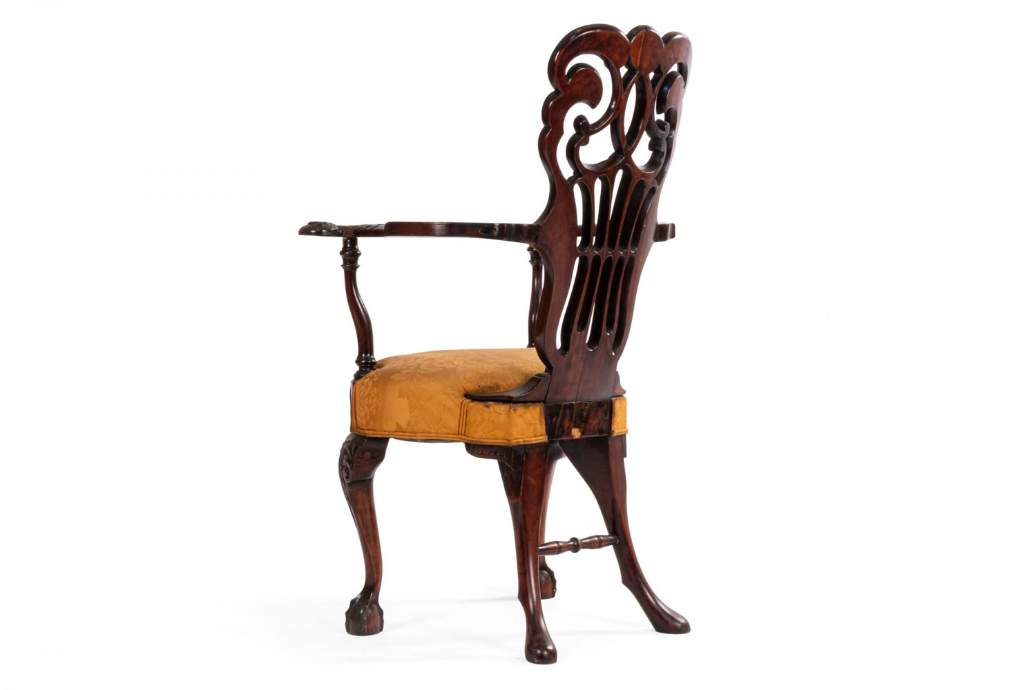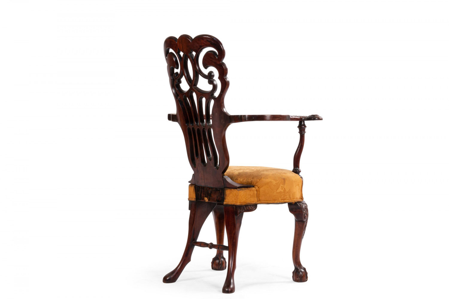 PAIR of English Chippendale style carved mahogany open back scroll Armchairs with gold seat. (19th Cent.).