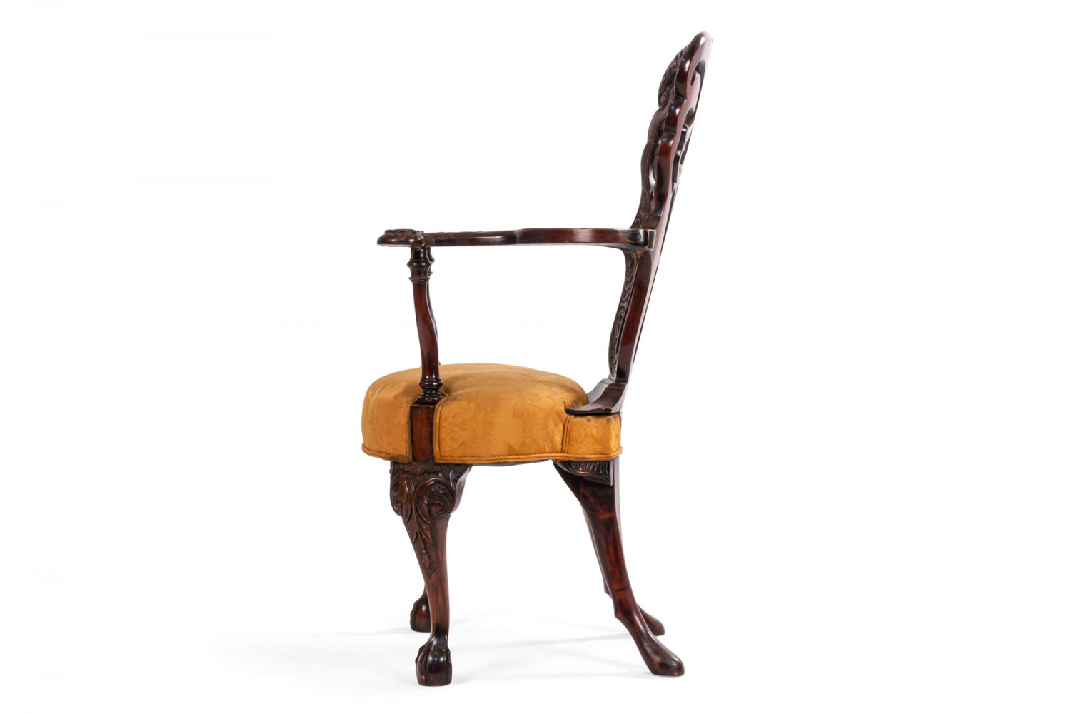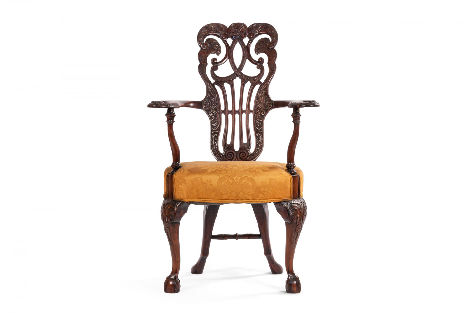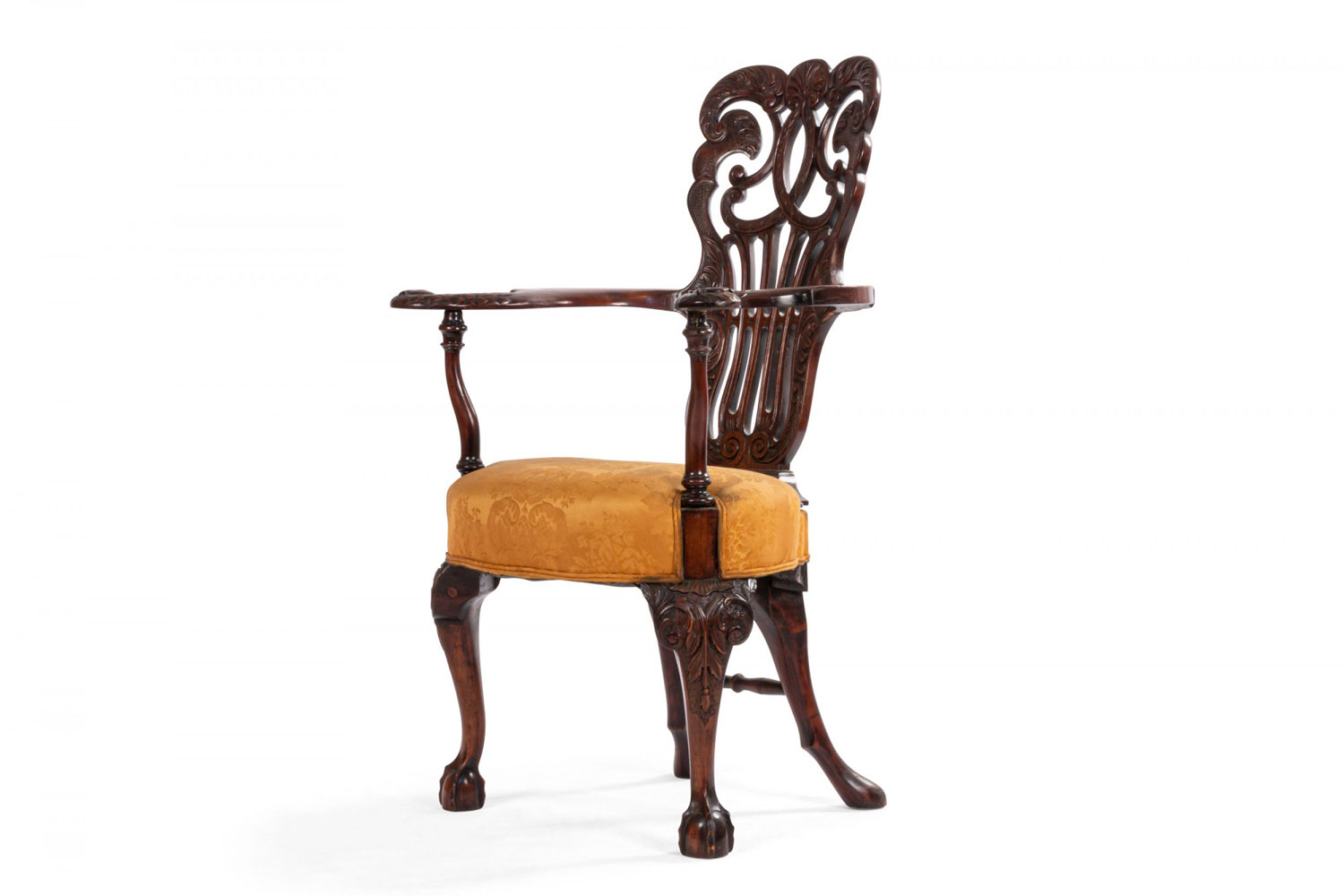 PAIR of English Chippendale style carved mahogany open back scroll Armchairs with gold seat. (19th Cent.)