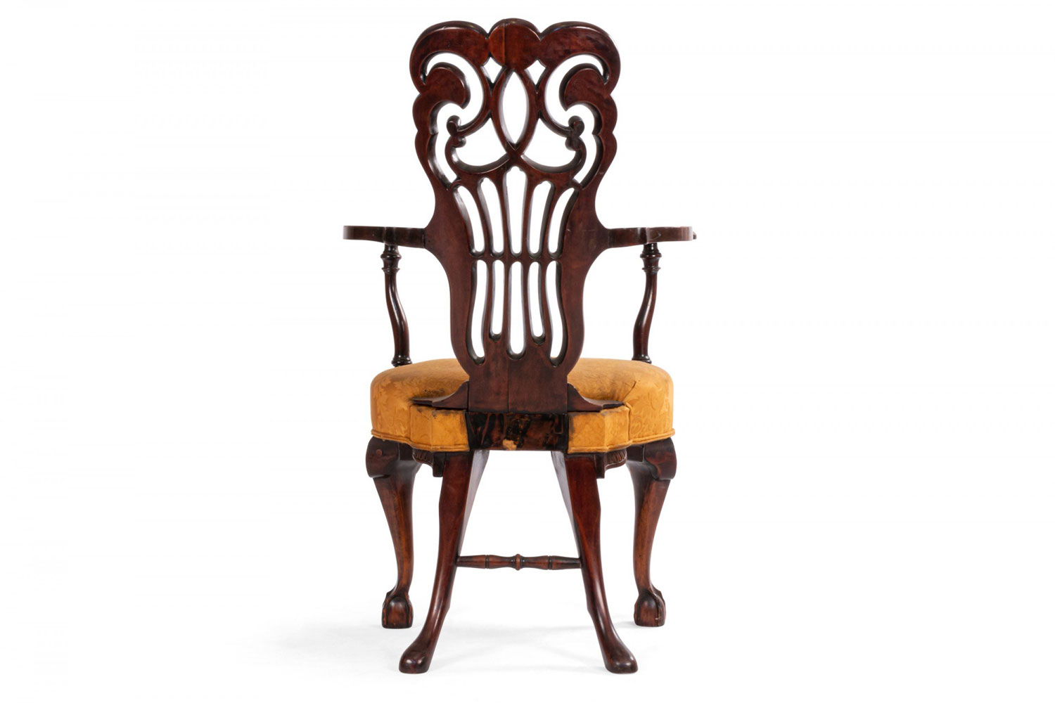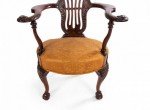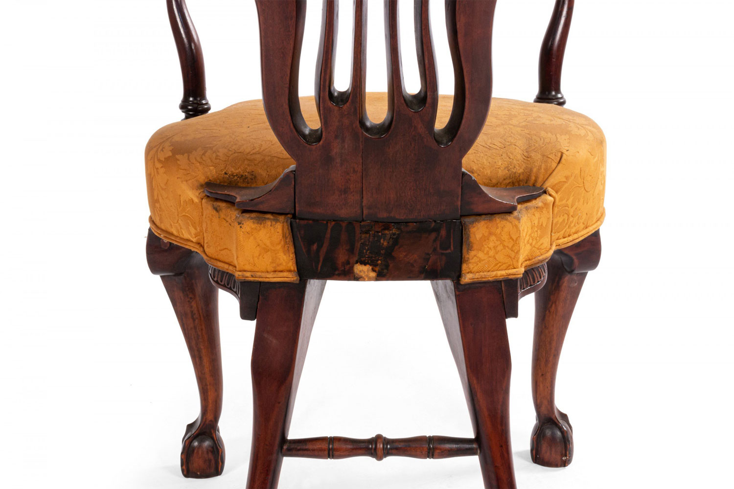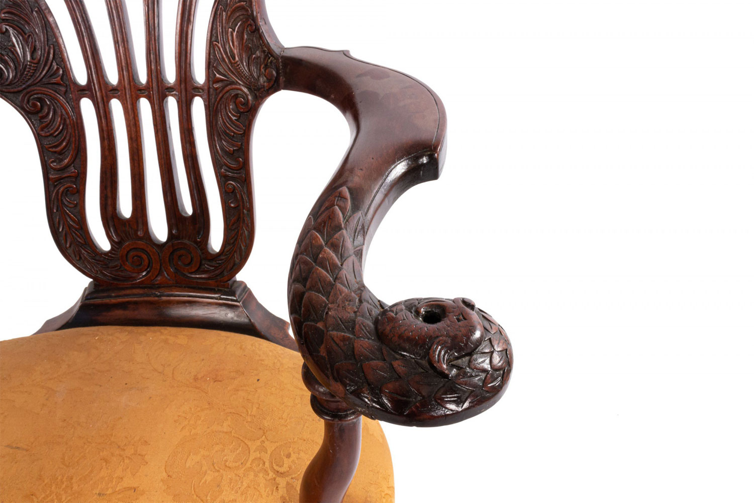 PAIR of English Chippendale style carved mahogany open back scroll Armchairs with gold seat. (19th Cent.)