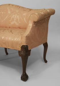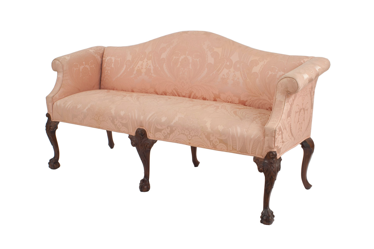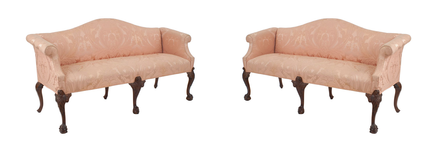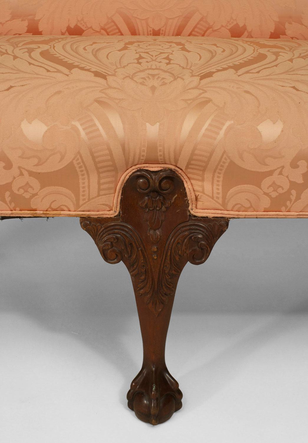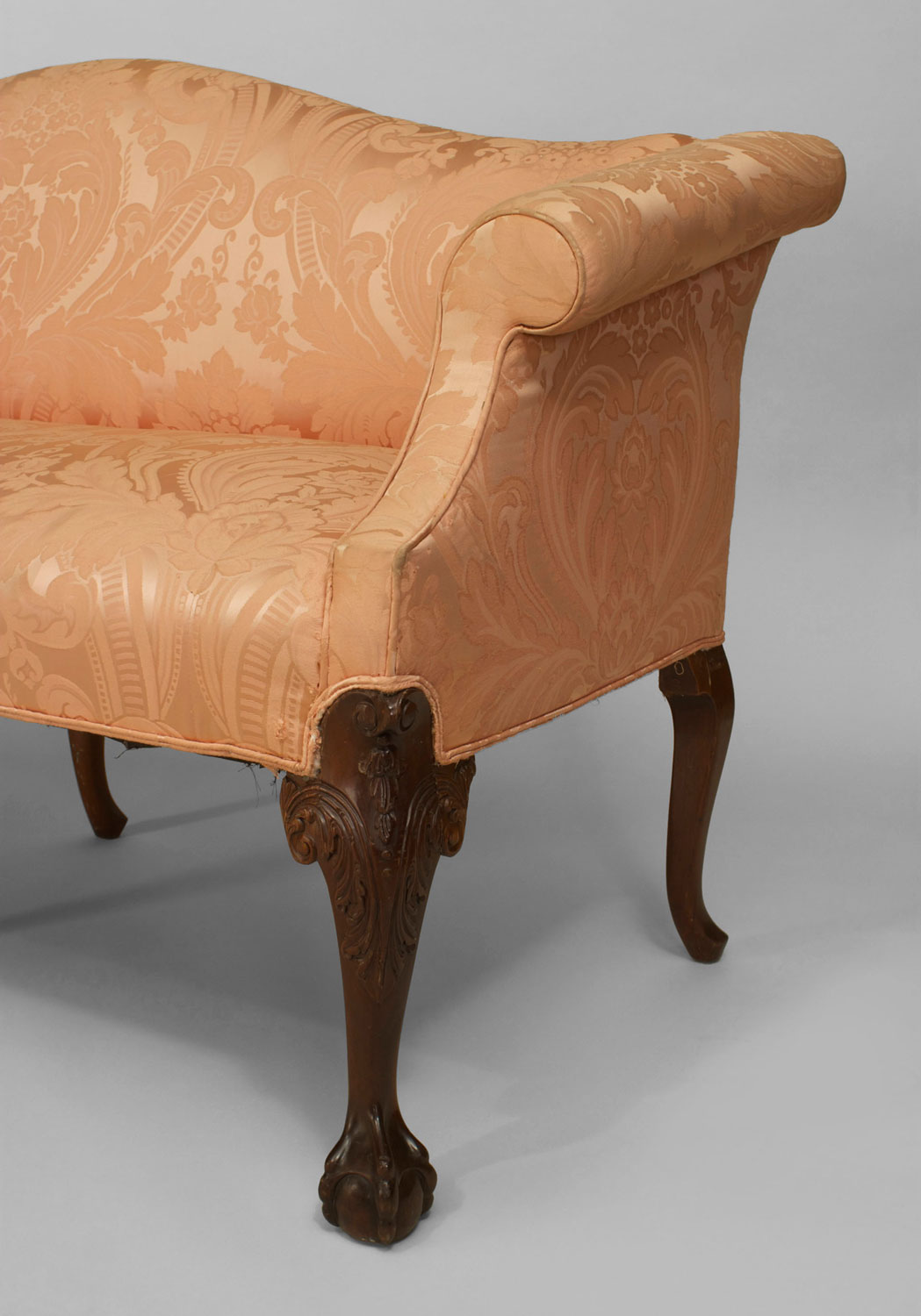 2 English Chippendale style mahogany camel back roll arm settees with pink upholstery (PRICED EACH)(20th Cent)