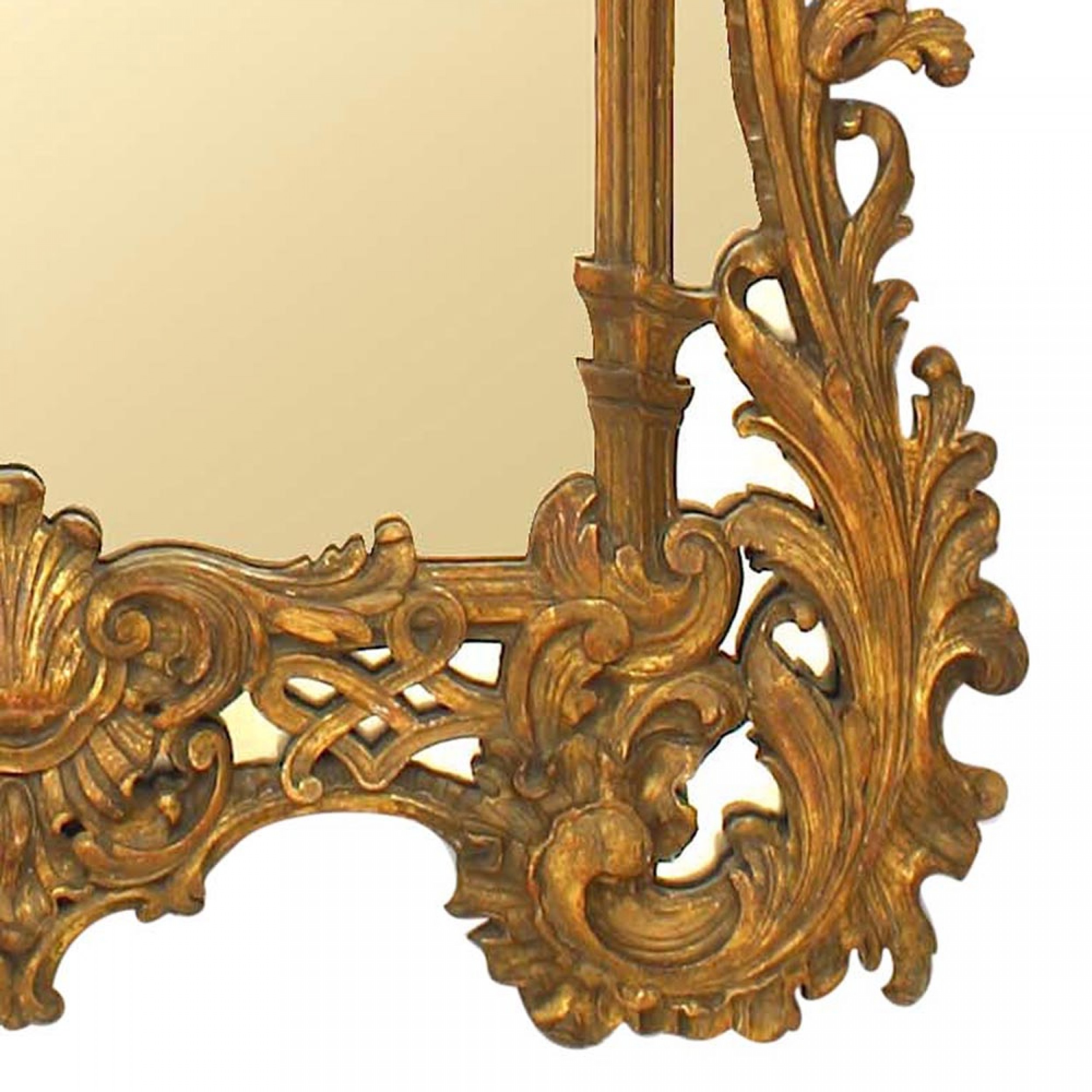 English Chippendale-style (19th/20th Century) carved giltwood wall mirror with foliate scroll form moulding.
