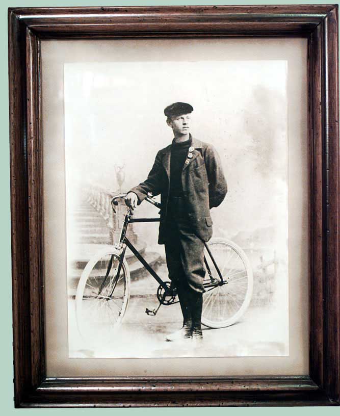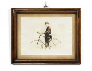 English Country style walnut framed photograph portrait of 19th Century boy with bicycle next to steps.