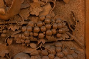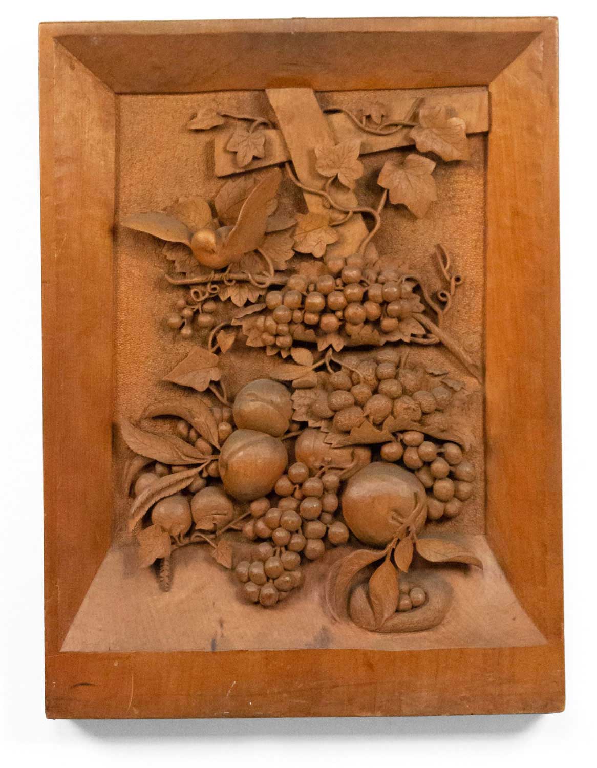 English Country style (19th Century) carved walnut wall plaque with grape and floral design and bird.