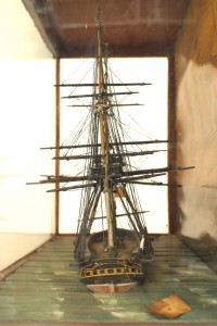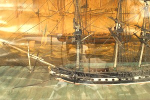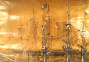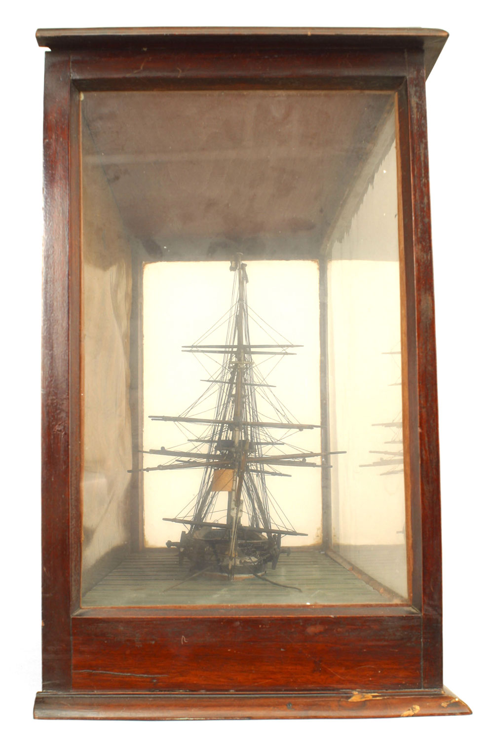 American Country style (19th Century) painted diorama wall plaque with clipper ship and American ship painted on back in mahogany frame encased in a wood and glass case.