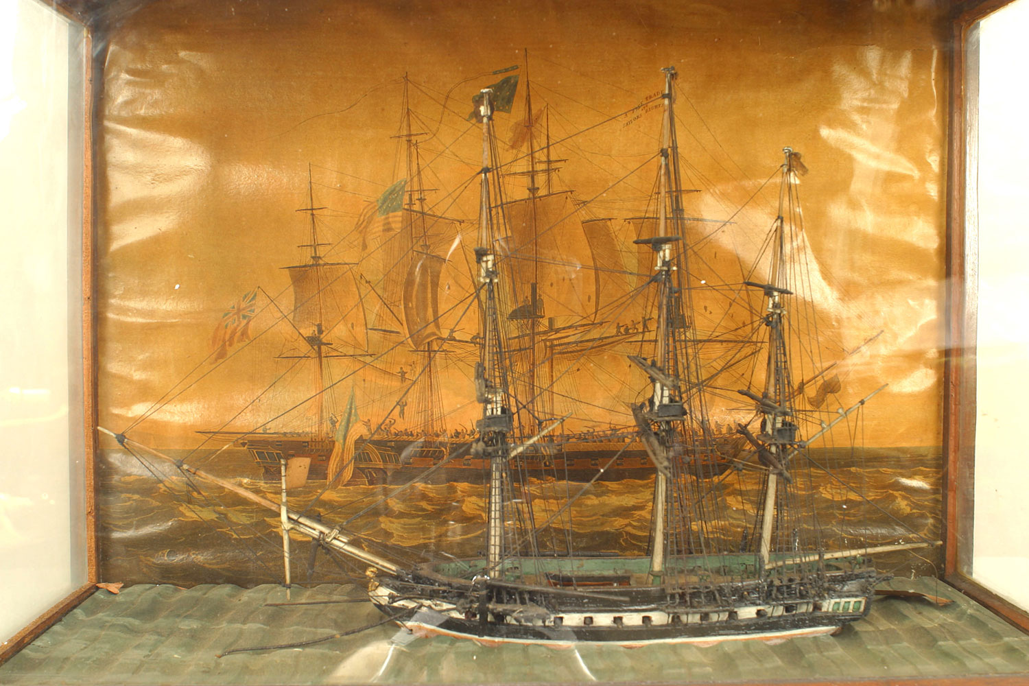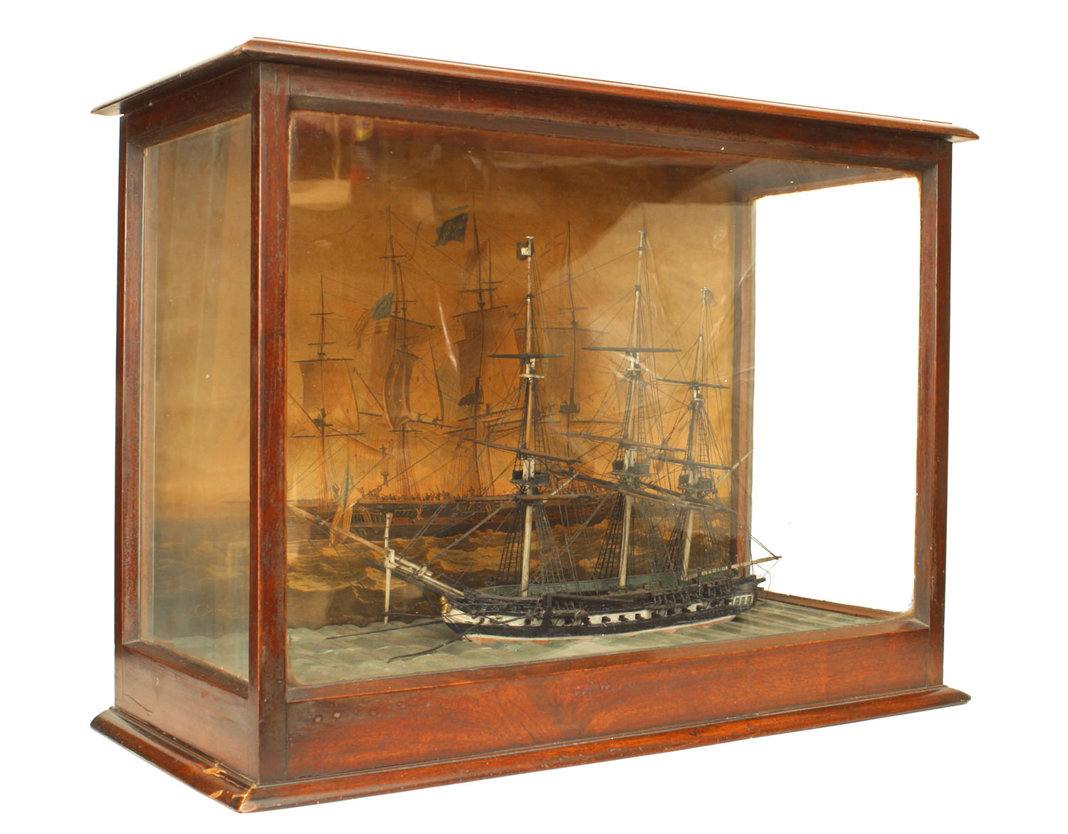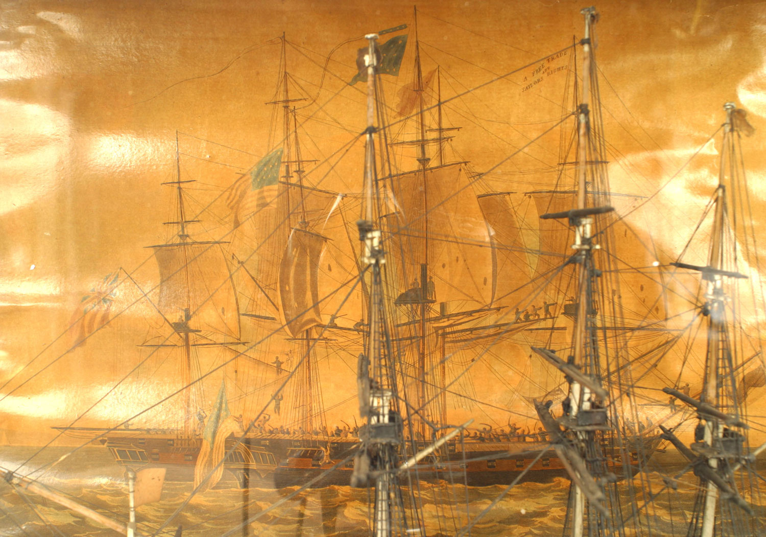 American Country style (19th Century) painted diorama wall plaque with clipper ship and American ship painted on back in mahogany frame encased in a wood and glass case..