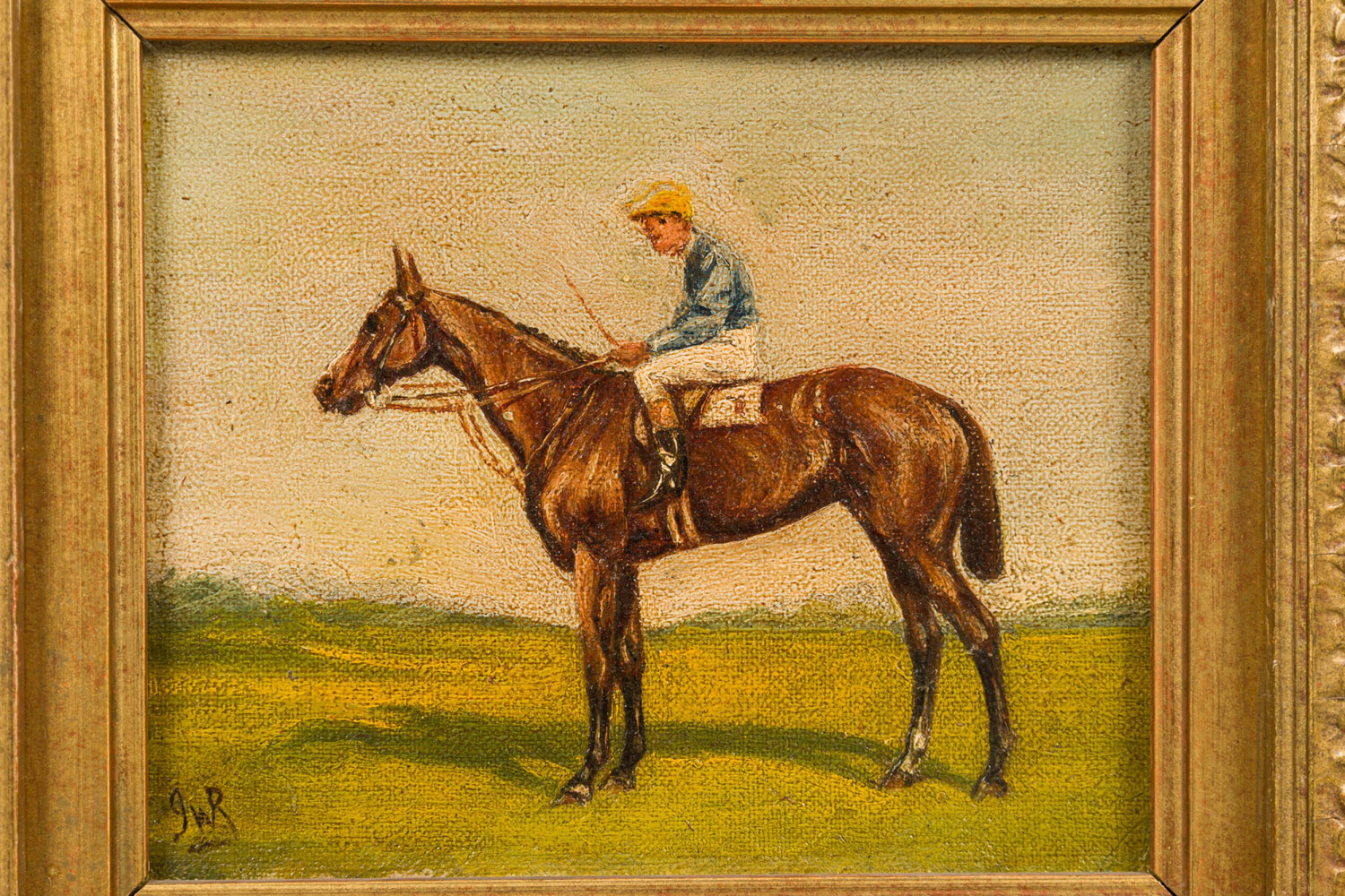 English Country style gilt framed oil painting of horse and jockey wearing blue shirt