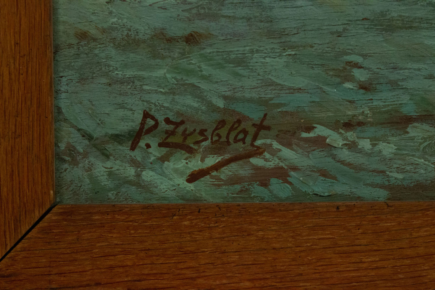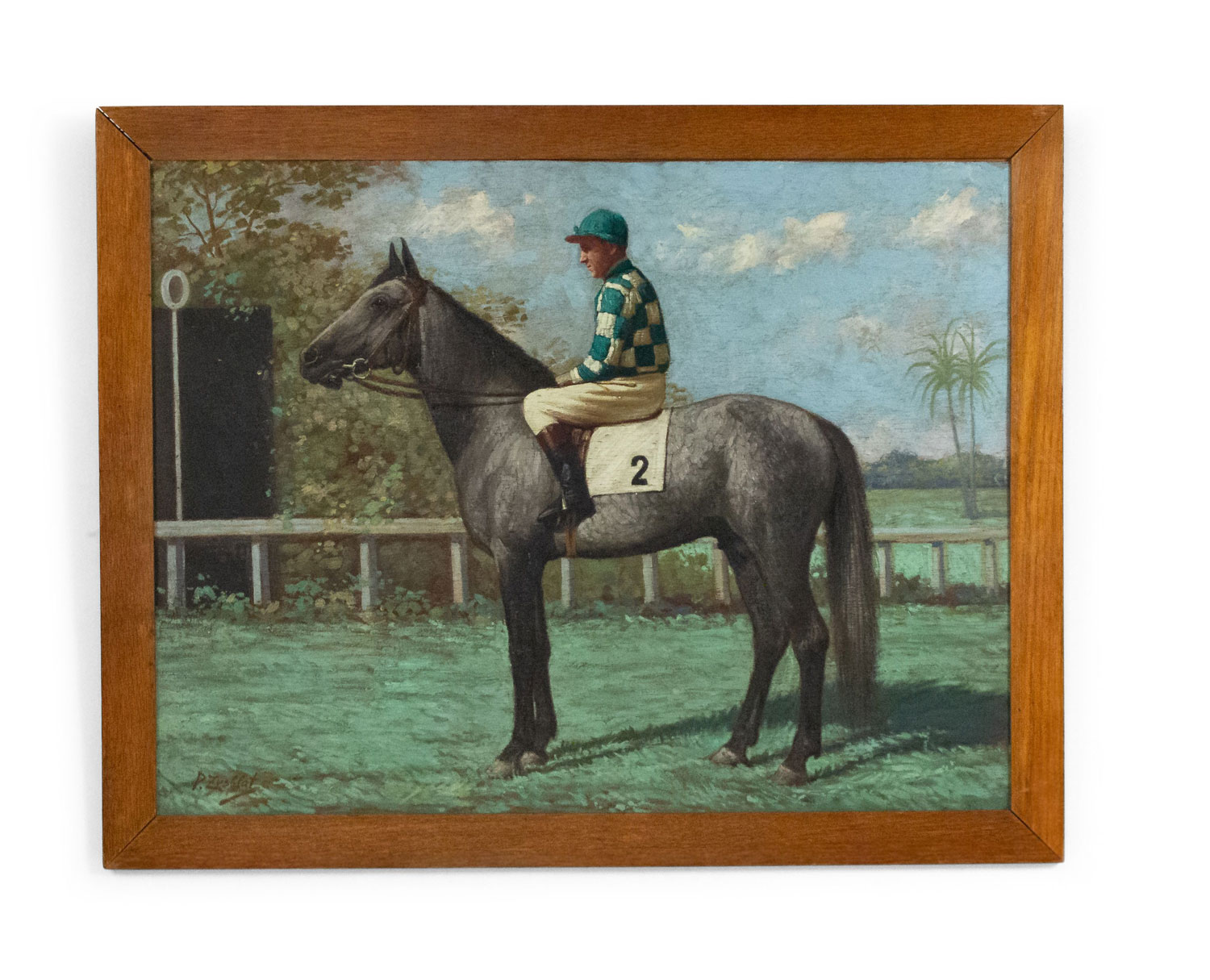 English Country style oak framed oil painting of horse and jockey wearing checkered shirt (signed: P. ZYSBLAT)